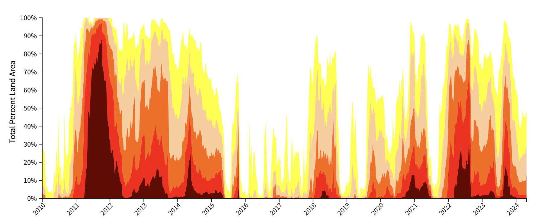 A graph outlining what percentage of land area in Texas has faced drought conditions over the past 14 years. (Source: National Integrated Drought Information System)
