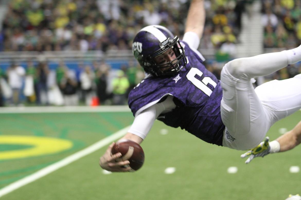It’s been just over a day since the TCU Horned Frogs pulled off one of the most remarkable comebacks in football history in the Valero Alamo Bowl. And no, it hasn’t gotten any less remarkable. Down 31-0 at the half, after the offense struggled to put three plays together without a penalty mucking up their efforts and the defense failed to contain Oregon’s star quarterback and running back, TCU head coach Gary Patterson and his now-legendary purple shirt (he changed from a black shirt at halftime) led his team to engineer 31 straight points to tie the game just seconds before the final whistle. Three harrowingly nerve-racking overtime periods later, TCU safety Denzel Johnson swatted away a fourth-down pass over the middle and the Alamodome erupted in purple and white euphoria. The 31-point comeback tied the largest come-from-behind win in bowl history. Pretty impressive for a team that didn’t even have their starting quarterback.