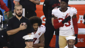 This is a Google document sent out to demonstrators. A group of about 20 TCU students dressed in black held up signs and didn’t stand for the national anthem at the start of the TCU’s game against Iowa State. Shanel Alexander, a senior political science major and organizer of the demonstration, said the protestors want “to be in solidarity with the NFL players who have decided to take a stand about the social injustices happening in this country.” “We can’t support a nation and a flag and an anthem that doesn’t support us,” Alexander said. San Francisco 49ers quarterback, Colin Kaepernick has said he is not standing for the national anthem to protest racial oppression. His decision has been criticized as disrespectful, but athletes such U.S. Soccer midfielder Megan Rapinoe, Seattle Seahawks cornerback Jeremy Lane and Denver Broncos lineback Brandon Marshall. All have knelt, rather than stand during the anthem. Diona Willis, a senior political science major and student organizer of the demonstration, said some TCU students decided to band together to stand in solidarity with individuals, such as Colin Kaepernick and actor Jesse Williams, who was criticized in the spring after speaking out against racial and social injustice. The group of TCU was racially mixed. Some demonstrators held up signs during the sit down. Some of their signs proclaimed things such as, “Unapologetic and black,” and “Oppression is wrong.” While others referenced Bible verses, such as Romans 12:15 and Malachi 2:10. The demonstration took place in the student section of Amon G. Carter Stadium, which is open to all TCU students. One protester, Elise Shropshire, a sophomore strategic communication and Spanish major, said a student threw an empty water bottle at her and another demonstrator. Colin Kaepernick, quarterback for the San Francisco 49ers, kneeled at a game during the National Anthem. Photo credit: Chris Carlson, AP Willis said she wants people to notice in order to raise awareness for such social injustices. The university had a response to the silent demonstration. Holly Ellman, the associate director of strategic communications for the marketing and communication department, wrote, “Texas Christian University recognizes the right of all members of the University community to express their views or to protest against actions and opinions with which they disagree.”