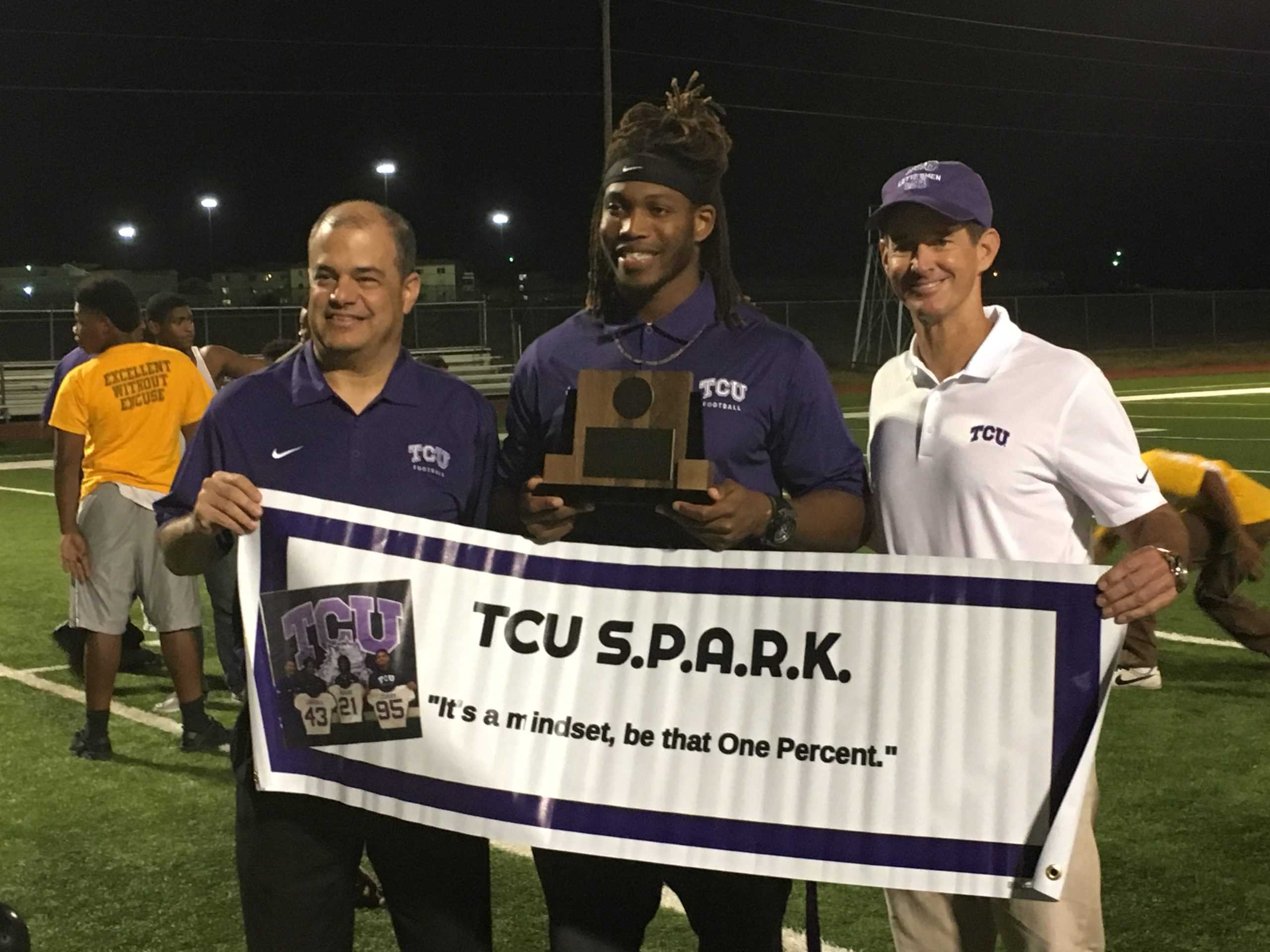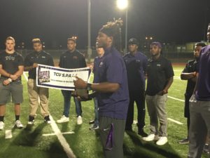 TCU senior defensive back Caylin Moore thought he was at O.D. Wyatt High School on Fort Worth’s east side Monday night to stress the importance of education to student athletes. But, instead of encouraging student athletes Monday night, Moore received special recognition for his dedication and commitment to his service to the community. Moore was awarded a plaque, naming him to the 25th anniversary Allstate AFCA Good Works Team. “I had no clue, it’s so humbling, I just thought we were at the school to speak to the kids,” Moore said. Moore said it seems natural to use his status as an athlete to encourage others by talking about his life. Moore and other TCU players have created a foundation – Strong Players Are Reaching Kids or S.P.A.R.K. – that visits schools throughout DFW to talk to student athletes about crucial times in their lives. “I have a 100 percent responsibility to tell my story,” Moore said. “What I can do encouraging others intellectually far outweighs me dancing in the endzone.” Ceylon Moore shares his story with youth football players. (Garrett Podell/TCU 360)Moore’s childhood includes being homeless for a time after his mother “left a volatile home,” according to a press release from Allstate. Moore said the message he shares far outweighs the nerves he sometimes has when it comes to public speaking. “When I get up and speak, something comes over me and I become a different person,” Moore said. Moore said that it’s about using your platform as an athlete and inspiring kids to be able to do something. However, S.P.A.R.K doesn’t just affect the youth outside of TCU. He said seeing his teammates and other students on campus develop on campus as leaders is a tremendous joy. “I feel like I have an important piece to share with the kids, but I’m always impressed with what my teammates have to say,” Moore said. He started his college football career at Marist College, and that is when adversity hit. “My third year there I hurt my back,” Moore said. “It was projected that I wouldn’t be able to play football again. But, my mom said I would play football again.” While he wasn’t playing football at Marist, Moore worked as a janitor in order to make money to continue his education. “Being a janitor showed me that no matter what I do, I must do it to the best of my abilities,” Moore said. After Marist, Moore went to Princeton University for a pre-graduate program and studied education and public policy, which sparked his interest in the field. After transferring to TCU in 2015, Moore found himself on the football field once again. Moore said his football career has been a blessing. “By way of God, I ended up at TCU, playing football,” Moore said. “I’m not even supposed to be here right now and I made it happen.” Even with the heavy time commitment of playing football, Moore continues to make time for community service. “Honestly, no matter what happens, my impact now as a man here will be far greater than my playing time,” Moore said. Moore’s teammates have taken notice of his passion. Wide receiver Michael Carroll said that Moore is dedicated to everything he does and his attitude and mentality is contagious. “It’s just a blessing to be around that guy,” Carroll said. After graduation, Moore said he wants to continue giving back to the community. He said he has seen how education can change lives and he wants others to feel those effects as well. “I want to work in educational policy and public policy so that I can ameliorate certain situations for disadvantaged youth, especially people of color,” Moore said. Moore will be recognized along with the other 25 members of the Allstate AFCA Good Works Team at the Sugar Bowl.