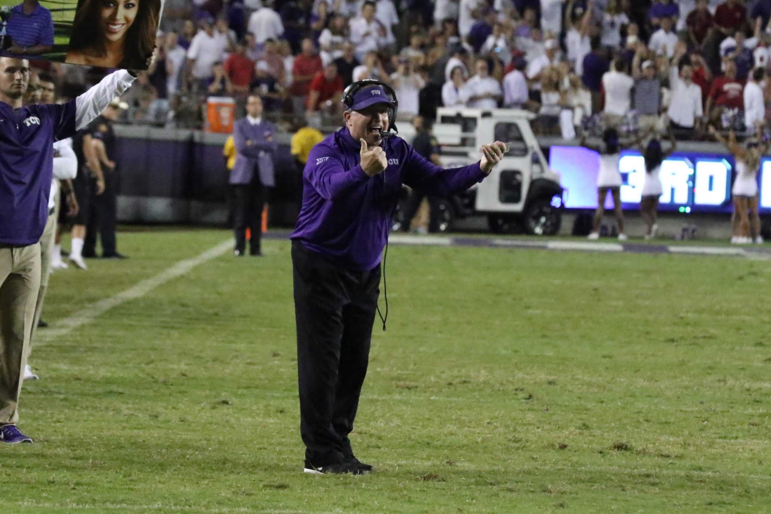A few key players could return to action Saturday when the Frogs travel to Morgantown, West Virginia to play the No. 12, undefeated Mountaineers. “We may get center Austin Schlottman, wide receiver/returner [KaVontae] Turpin back, but they’ll be game-time decisions,” TCU head coach Gary Patterson said. Offensive lineman Trey Elliott could be back after missing the first six games of the season with what was once-thought to be a season-ending injury. Their absence has made a noticeable difference on the Horned Frog offense. “I think offensively, they’ve lost a little swagger,” Patterson said. “So, we need to get those guys back.” TCU may also get some returning help in the defensive backfield as well. “There’s a possibility of cornerback Julius Lewis being back for this ballgame, which would be a big help,” Patterson said. Lewis played in all 12 games last season, starting four including the Valero Alamo Bowl. Patterson said “there’s no in between” with West Virginia quarterback Skyler Howard and that he “goes all-in” running and throwing the football. Howard, a Fort Worth native who played for Brewer High School, has passed for 1,590 yards and eight touchdowns with a 66.1 percent completion rate. He’s also rushed 44 times for 195 yards and three touchdowns. The Mountaineers are also strong at their wide receiver and running back positions. Running back Justin Crawford averages 74.6 rushing yards per game and 5.57 yards per carry. Wide receiver Shelton Gibson is ranked No.13 nationally in all-purpose yards, No. 14 in yards per catch and No.19 in yards per game. “I think [WVU head coach] Dana Holgorsen really emphasizes the run game, while also going up-tempo with his spread offense,” Patterson said. Defensively, TCU has changed their outlook. “I’ve given up yardage to make sure we get back to playing base defense,” Patterson said. “We need to generate more takeaways.” TCU’s bye week also allowed for some key defensive players to regain their health. “Defensive end Josh Carraway has been playing at 80 percent because of an ankle injury, but he’ll be at full strength, as well as defensive tackle Aaron Curry,” Patterson said. TCU is 3-2 against the Mountaineers since joining the Big 12 with West Virginia in 2012. The tenacity in the two teams has led games to be decided on the final play and two in overtime. TCU is 2-0 in Morgantown. “We’ve always barely got out of there and had to come from behind to win,” Patterson said. “We have to be able to carry our own energy into someone else’s stadium.” TCU kicks off in Morgantown against the Mountaineers at 2:30 p.m.