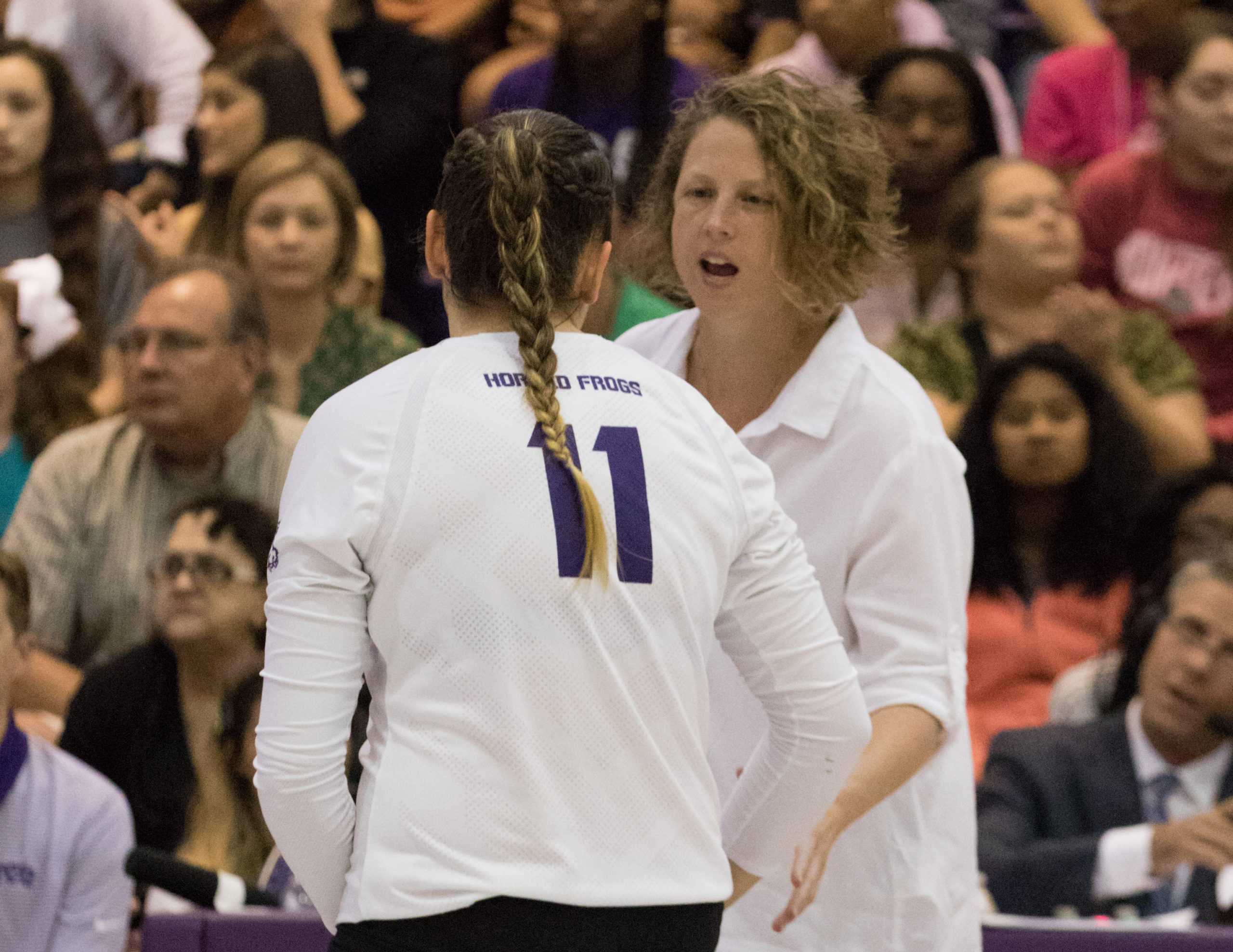 When Lamprini Konstantinidou checked her phone in December 2014, she had a text message from her volleyball coach, Jill Kramer, saying they needed to talk. “When she says that, you’re usually in trouble,” said Konstantinidou, who played setter for West Virginia at the time. As a first-year player, Konstantinidou played in 29 of the Mountaineers’ 30 matches. She led the team with 971 assists. Now after her first season, she found out that she is not in trouble, but rather that Kramer was leaving West Virginia. Kramer, for whom Konstantinidou had left her home of Greece to play volleyball, was leaving for TCU. Lamprini Konstantinidou and TCU Director of Volleyball Jill Kramer talk strategy during a timeout. (Sam Bruton/TCU360) However, before the meeting ended, Kramer told her she was welcome to follow her to Fort Worth. The next move Transferring to TCU meant Konstantinidou would have to sit out a season because of the NCAA rules. Still, she wanted to follow Kramer. Over that summer, she talked to her family about the decision. She said they supported her decision, saying she should “be with people where I feel safe and comfortable.” Konstantinidou said the conversations she can have with Kramer are similar to the ones she can have with her mom. “I feel like we connect really well,” she said. “I can talk to her about things besides volleyball, like school and other things.” Kramer knows adjusting to life in American can be difficult. “My husband is from the Netherlands,” she said. “I know what he went through to come here, so I know what she’s going through.” She added that body language and eye contact are keys to dealing with language barriers. Being at TCULamprini Konstantinidou sets up Natalie Gower for a hit. (Sam Bruton/TCU 360)Konstantinidou said transferring distracted her from being homesick. “My goal was to go where Jill went,” she said. “I wasn’t really thinking of home.” Kramer said she likes the progress Konstantinidou has made after sitting out a year. “She’s now starting to get back to being herself on the court and getting into the flow of being on a team with people who have played together for a year,” Kramer said. Konstantinidou said she benefitted from having a year to adjust. Lamprini Konstantinidou fires up her teammates. (Sam Bruton/TCU 360) “I did everything with the team but traveling and playing,” Konstantinidou said. “I was able to focus on my academic part and go to class everyday, plus I practiced, lifted and conditioned more.” Kramer said she was impressed with Konstantinidou’s work ethic after seeing how she handled herself when she could not step on the court. “She put in a lot of extra time on her own to improve and get better, which was really cool to see,” Kramer said. This season Konstantinidou has played in all 25 matches and all 89 sets. She has had 507 assists. The Frogs’ regular season finale is Wednesday, Nov. 23 in the University Recreation Center against the West Virginia Mountaineers. First serve is set for 7 p.m.