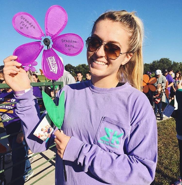 Freshman Tess Clausen holds a purple flower in memory of her Grandpa Pete who she and her family lost to Alzheimer’s (Photo courtesy: Alzheimer’s Association North Central Texas Chapter). TCU’s Sigma Kappa was this year’s top fundraiser in the annual Walk to End Alzheimer’s. The Kappa Eta chapter of Sigma Kappa raised $33,594.54 on Oct. 22 for the Alzheimer’s Association’s North Central Texas chapter during the 2016 walk. Sigma Kappa’s runner-up raised $9,000. “It was a pretty significant lead, which we were grateful for everything,” said Elizabeth Sehon-Harris, Alzheimer’s Association public affairs coordinator. “But [Sigma Kappa] really came in large.” The Kappa Eta chapter was also the fourth biggest fundraising chapter in the national sorority, whose national philanthropic efforts have been focused on the Alzheimer’s Association since 1984. Nationally, Sigma Kappa has raised over $4.1 million to the Alzheimer’s Association since 1989. Last year, TCU’s chapter placed third for top fundraising efforts. This year, there were 3,000 participants in the annual fundraising walk, including 200 sisters from Sigma Kappa, both participating and volunteering. “They helped volunteer,” Sehon-Harris said. “So not only did they raise an incredible amount of money, but they actually came out with boots on the ground.” Volunteers were asked to write and sign 600 advocacy cards to local government officials to help raise awareness and to have the Alzheimer’s Association voice heard by Congress. “They were just a vital part of the Walk to End Alzheimer’s, and we hope to continue that relationship each year with [Sigma Kappa],” Sehon-Harris said. Seniors Christa Martin and Christina DeMarois along with sophomore Charlee Bisch stand under the Sigma Kappa tent, getting ready to ask walk participants to sign advocacy cards (Photo courtesy: Alzheimer’s Association North Central Texas Chapter). Sigma Kappa’s fundraising efforts started in the spring with their second annual Sigma Kappa Carnival, where every fraternity and sorority participated in games and donations toward the Alzheimer’s Association. Sigma Kappa’s vice president of philanthropic service, Clare Wilson, said that the sorority was really excited about the news and their fundraising efforts. “I know it made all of us very excited at chapter meetings to hear about it, and seeing at the walk all of us being recognized as a top fundraiser there that day,” Wilson said. Wilson said many of the women in the chapter have family members who have Alzheimer’s, which drove her to become the chapter’s philanthropy chair. “I think having some of my closest friends have family members who are affected by it that I have met definitely drives me to be a leader for the cause,” Wilson said, “and motivate the women to fundraise and understand the meaning and importance of our philanthropy.” According to the Alzheimer’s Association, 350,000 Texans that are 65 and older have the disease. It’s estimated that there will be 500,000 Texans with Alzheimer’s by 2025 because of the large population of baby boomers. Sehon-Harris had a grandmother who passed away from the disease. She said she was close to her grandmother, who inspired her to study journalism in college. “She was incredibly intelligent, bright, witty, clever and she basically stopped forgetting, and it really changed who she was completely,” Sehon-Harris said. “And then toward the end, she didn’t really know who I was. It was pretty devastating; it’s hard to see someone who you love to go through that.” Christina DeMarois, Alzheimer’s Association intern and Sigma Kappa member, also had a close relative who passed from the disease: her uncle’s mother. “I don’t remember a lot of it,” DeMarois said. “I just remember her starting to forget who we were, who all my cousins were and everything, so that was kind of hard to understand, especially when you’re young.” DeMarois said new research suggesting that Alzheimer’s could be genetic motivated her to get involved. “Knowing that they are finding that it could be genetic, thinking to my cousins or my uncle and how it could affect them with something, that really sparked me to want to get involved,” DeMarois said. The Alzheimer’s Association’s goal was to raise $355,000 this year, but they’re not there yet as December draws near. “Our goal was $355,000, and so far, we’ve only reached about $280,000,” Sehon-Harris said. “So we’re really still in need of more funding toward the walk, which is really crucial. We’re pretty much asking everyone, everywhere if they can please donate toward the walk.” There is still time to act. People have until Dec. 31 to go to act.alz.org/fortworth to donate and help the Alzheimer’s Association achieve its goal. Both Sehon-Harris and Wilson said they hope to continue their organizations’ relationship to help further the awareness and support for Alzheimer’s research and treatment. Sigma Kappa sophomore Alexis Hood holds an orange flower, which represents her support for the Alzheimer’s cause as she stands next to her sorority sister, sophomore Haley Decker (Photo courtesy: Alzheimer’s Association North Central Texas Chapter). “Every year, Sigma Kappa has surpassed the last year’s goal,” Wilson said. “So, I hope that next year we possibly could get above $35,000, and maybe in the future we could get above $40,000, and gradually work our way up to really committing ourselves to the Alzheimer’s Association.”