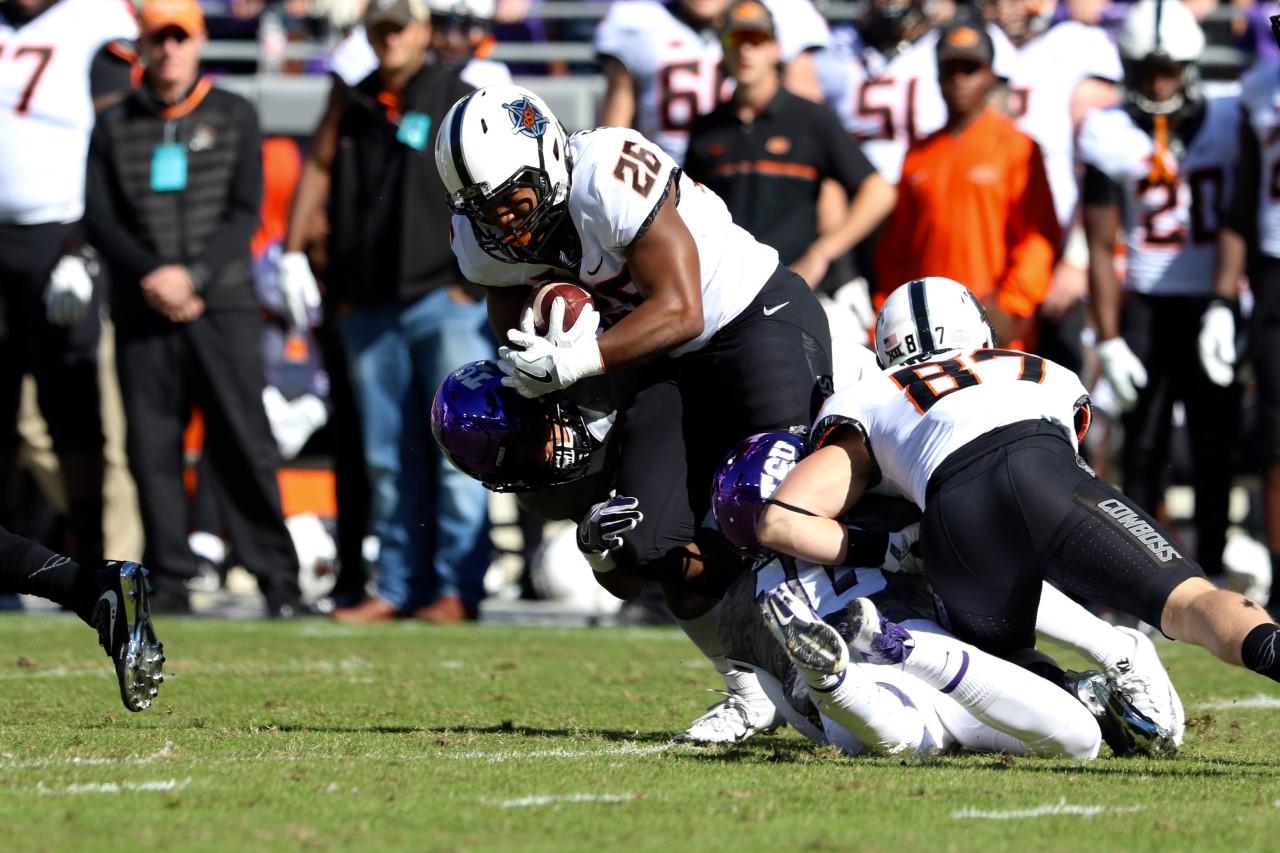 TCU failed to gain bowl eligibility Saturday against No. 11 Oklahoma State, falling to the Cowboys, 31-6, in TCU head coach Gary Patterson’s 200th game. “I’ve got to give Coach Gundy and his team credit because they kicked our butts,” Patterson said. “I’m embarrassed for my players and for myself.” The 25-point loss was the worst loss under Patterson. “We’re embarrassed,” TCU running back Kyle Hicks said. Here are five things to know about Saturday’s contest between the Horned Frogs and Cowboys. 1. Oklahoma State defense keeps TCU offense under wraps One game after Hicks rushed for a career-high 192 yards and five touchdowns, the Cowboys made it clear that they would rather any other Horned Frog do the heavy lifting for the TCU offense. Hicks had 25 carries for 47 yards. Hill threw his Big 12-leading 11th interception to an Oklahoma State defense that leads the conference in interceptions forced with 12. TCU just couldn’t find any rhythm on Saturday. 2. Oklahoma State’s top-flight passing game broke out in the second half OSU quarterback Mason Rudolph had the fifth-most passing yards in the nation heading into Saturday’s game. However, against TCU Rudolph has just 84 passing yards. One reason for TCU’s successful first half pass defense is that they were able to generate pressure. In the first half, TCU sacked Rudolph twice and forced a number of hurried throws. In the second half, it was a different story. Rudolph finished the game with 207 yards passing and a touchdown. Even though TCU allowed 31 points, the defense wasn’t terrible. They were always in position to make plays, but tackling issues were their undoing. 3. Kenny Hill unravels in the second half Against Baylor in his last game, Hill threw for 244 yards, a touchdown and no interceptions. After the first half against OSU, he had 65 yards passing and a touchdown. In the second half, Hill reverted back to erratic throwing patterns, as he threw two interceptions in the last 30 minutes. He leads the Big 12 in interceptions thrown with 12. 4. The Cowboys ground game dominates Horned Frogs Despite the Cowboys’ lackluster aerial attack, the Cowboys running backs have found some cracks in the TCU run defense. Running back Justice Hill had 16 carries for 155 yards and running back Chis Carson had 17 carries for 147 yards and a touchdown. “On the last drive of the game when OSU had the ball, we got three guys run over,” Patterson said.”You have to decide if you want to be a football player, simple.” 5. TCU just couldn’t convert on fourth down On TCU’s last offensive play of the first half, it had fourth and goal from the one yard line. Instead of running out a traditional offense, TCU opted for a wildcat attack with running back Hicks taking the snap and Hill on the sidelines. Hicks faked a handoff and threw an incomplete pass to tight end Cole Hunt that ended the Horned Frogs’ drive without any points scored. “I think it hurt us a little bit, and it would’ve made a difference going into the half up 13-10,” Patterson said. “We worked on that play a lot and all we had to do was execute.” “It was a pass-option, and I tried to do my best to deliver the ball to Cole [Hunt], but I failed,” Hicks said. At the beginning of the fourth quarter, TCU had the fourth-and-one on the OSU five-yard line, and they opted to run wildcat formation with Hicks at quarterback, which resulted in no gain and a turnover. “Why not?” Patterson said when asked about why he continued to use wildcat formations. His running back had no problem with the wildcat either. “You get to be patient and read your blocks,” Hicks said. “I was comfortable back there.” TCU’s next game is in Austin, Texas on Nov. 25 against the Texas Longhorns. Kickoff is set for 2:30 p.m.
