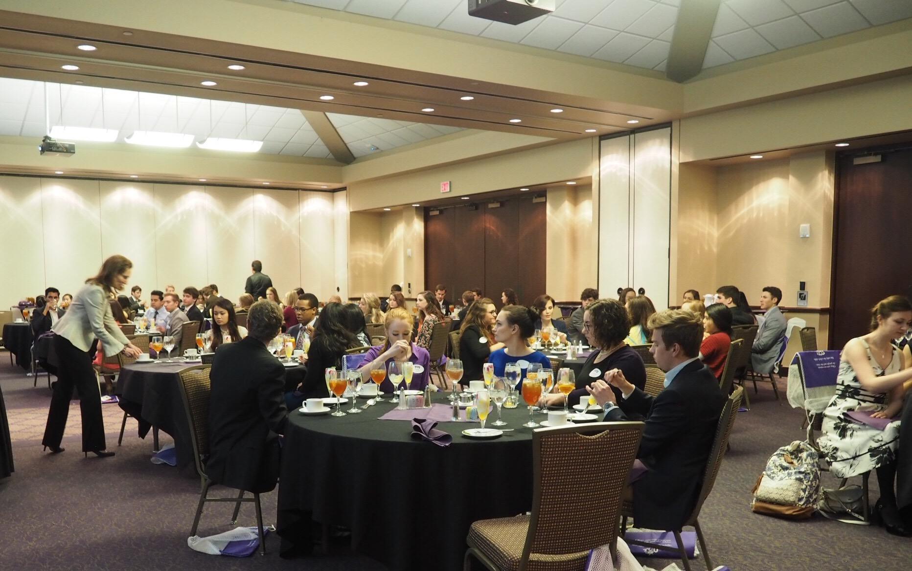 Chancellor’s Scholars listen to the presentation by Ann Louden during the Etiquette Dinner (Makenzie Stallo/TCU360). Chancellor’s Scholars were treated to a five-course meal as part of an etiquette dinner on Tuesday night. Around 70 students gathered in the Dee J. Kelly Alumni & Visitors Center to undergo proper etiquette training and gain first-impression skills that can benefit them in their professional lives. Chancellor’s Intern Lauren Nixon who organized the event said it serves as a great professional development opportunity. “It’s not about the rules or doing things right or wrong,” she said. “It makes everyone at the table comfortable and makes the flow of the meal really nice.” Students learned the proper use of utensils, how to eat in a polite manner, and conversation skills to use when interviewing with future employers. Ann Louden, the chancellor’s associate for strategic partnerships, hosted the event and guided the students through the meal while demonstrating proper technique. “I love that students come in fearful and they walk out confident because they’ve had all their questions answered,” Louden said. “The comfort that we have going into settings that are unfamiliar to us, makes us successful.” The theme of the night was movie clips. Clips from films like Elf, Beauty and the Beast and The Princess Diaries demonstrated poor etiquette and conversation skills. The clips played between demonstrations throughout the meal included soup, salad, palate cleanser, main course and dessert. Emma Brilleslyper, first-year biology and French double major, said the event was alluring because she’d never had training in dining etiquette before. “I have never used more than one fork during a meal,” Brilleslyper said. “It was fun to learn how to use it and present yourself well.” First-year Nicholas Forslund said he found the interview and conversation techniques the most useful. “I think going back to basics is very important,” he said.