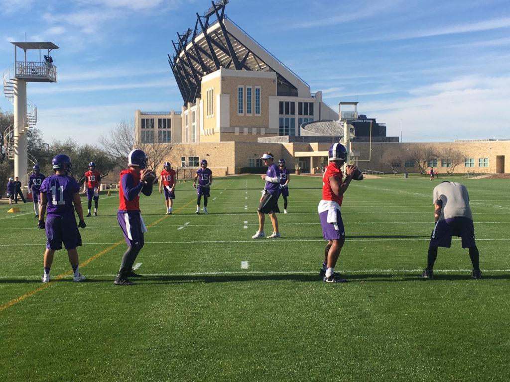 The Horned Frogs returned to the field Friday for just over two hours to kick off their first spring football practice – a day full of high energy levels as players challenged themselves in drills and were hungry for knowledge from coaches. “I thought they ran around well, I was very impressed today,” TCU head coach Gary Patterson said. “Our whole goal through spring ball is getting everybody back by June.” The Frogs have a lot of key players that are injured this spring including three linebackers; senior Travin Howard, senior Sammy Douglas and sophomore Montrel Wilson; sophomore offensive guard Cordel Iwuagwu and junior defensive tackle Joseph Broadnax Jr. to name a few. With the injuries at hand, growing younger players up will be as important as ever for TCU. “We teach everyday,” Patterson said. “On day four we will practice in a short scrimmage before spring break to see who can tackle and who can’t tackle, who can block and who can’t block. We have done it the same way for years, then we come back and then we have three weeks.” The Frogs have new talent coming in this season and a lot of players coming back. Freshman quarterback Shawn Robinson and freshman offensive lineman Wes Harris are among the top spring new comers to watch out for this fall. The frogs have 17 players returning this season, 10 offensive players and seven defensive players. Getting stronger has been a theme this off-season and the coaching staff has highlighted that by bringing back the Night of Champions on Feb 28. The Night of Champions showcased some of the strongest players to compete in the bench press, squat, power clean and incline to break records and max out their weight in their specific category. “You have to help them in the off-season so you can grow guys up. It’s not about numbers out here, you have to mentally get them back to where they feel like they can do it and that’s why we brought back the Night of Champions,” Patterson said. “We had some great numbers.” The coaching staff has returned the “accountability olympics,” in which coaches draft on camera, not by ability, but by accountability. The players are on teams and are expected to step up as a team and take accountability for their actions. “If you’re not doing it off the field, you’re probably not doing it on the field,” Patterson said. This is an aspect of the game that not only impacts players and coaches on the field, but off the field as well, and will continue throughout the spring and upcoming football season. “You have to keep changing the weakness in the fence and change it where you have the energy. You don’t necessarily have to tear down the whole foundation,” Patterson said. “You have to keep your standards high. If you’re not careful you become average and we are not about average here.” Spring practice will conclude on April 8 with the annual spring football game at Amon G. Carter Stadium. TCU will open the 2017 season on Sept. 2 at home against Jackson State.