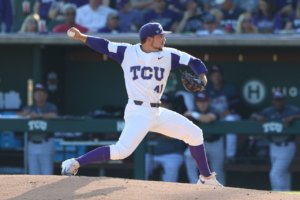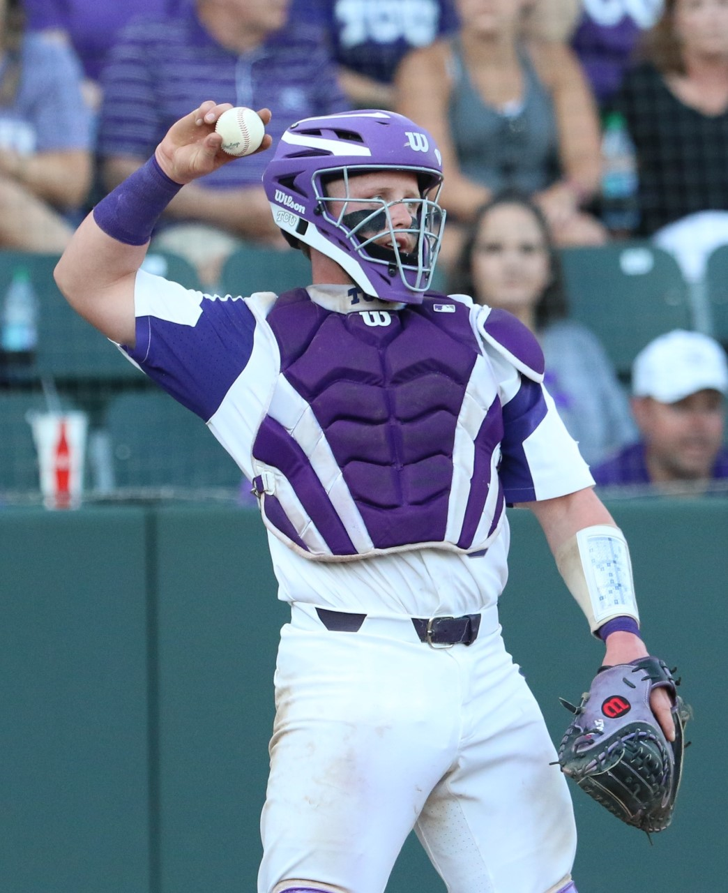 Evan Skoug put TCU one win away from a fourth straight trip to the College World Series with a two run home run in the eighth inning Saturday that gave the Horned Frogs a 3-2 lead and a game one win over Missouri State. “Well, what an amazing college baseball game,” said TCU head coach Jim Schlossnagle. “That one will go down as one of the best ones ever played in this ballpark as far as I’m concerned.” Down 2-1 with one runner on base and one out in the eighth, Missouri State brought in a left-hander from the bullpen to replace starter Dylan Coleman on the mound. Skoug welcomed the new pitcher, Jordan Knutson, to the game by launching a 2-1 pitch over the right field fence to give TCU a one-run lead. The homer was Skoug’s 19th of the season, moving him to fifth all-time in both RBI’s and home runs in a career at TCU. “Somebody asked me in the press conference yesterday if Evan had done enough to go down as one of the great TCU players,” Schlossnagle said. “He certainly had long before today, but he definitely put a stamp on that tonight.” After struggling through the first month and a half of the season, Skoug has hit 15 long balls in his last 32 games. “It is really hard to put that [home run] into words,” Skoug said. “I’m very fortunate and very thankful. That was one of the coolers things I have done in my life.” Sean Wymer (5-4) earned the win out of the bullpen for the Frogs, as he entered in the seventh inning and picked up five key outs to bridge the gap between starter Jared Janczak and closer Durbin Feltman. Feltman, the nation’s leader in saves, came on for the Frogs in the top of the ninth and allowed two runners to reach base but induced a 6-4-3 double play to pick up his 17th save. Feltman is now 26 of 29 on saves in his career and four out of four in postseason save opportunities. Janczak (9-0) got the start for TCU, and he battled a dangerous Missouri State offense through 6.1 innings. Janczak gave up single runs in the second and fifth innings and left the game trailing 2-1.