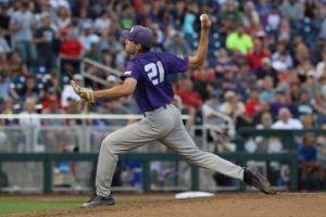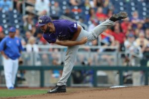 In what started as a pitcher’s duel early between TCU’s Mitchell Traver and Florida’s Jackson Kowar Friday night, ended in a Horned Frog blowout victory over the Florida Gators, 9-2. “Certainly felt good about the way Mitchell started the game for us and Jackson on their side was beyond amazing,” TCU head coach Jim Schlossnagle said. “I started to think after he was punching us out there so much, has there ever been a 20-strikeout game in the World Series?” Traver retired the first seven Gators that he faced, and Kowar put away the first eight Horned Frogs that he faced, striking out seven. Mitchell Traver releases a pitch against the Florida Gators in a 9-2 TCU victory. (Photo by Sam Bruton) After Kowar struck out the first two TCU batters of the third inning, Horned Frog shortstop and Omaha native Ryan Merrill extended his hitting streak to six with a single to right field. TCU then scored two runs on back-to-back doubles by right fielder Austen Wade and designated hitter Zach Humphreys to give TCU a two-run advantage. After Traver struck out the first Gator in the bottom of the third, UF catcher Mike Rivera clubbed a towering home run to left field that cut the TCU lead in half, 2-1. Traver then had trouble shaking off the homer, walking the next two batters and surrendering another run on UF shortstop Dalton Guthrie’s deep double to left field that just missed leaving the ball park. Traver’s defense picked him up on that play, as left fielder Josh Watson threw out UF right fielder Ryan Larson after he overran the bag at third base. The Horned Frogs then jumped back in front on a two-run triple by Watson, doubling the TCU lead to 4-2 in the top of the fourth. The triple was both Watson’s and the College World Series’ first of 2017. From there, the TCU bullpen shut down the Florida offense. Schlossnagle turned to freshman reliever Charles King who entered the game with runners on first and second, and two outs in the bottom of the fourth. After he walked the first batter that he faced, King struck out UF center fielder Nick Horvath looking to put out the fire without allowing anyone to cross home plate. Traver left the game with two earned runs allowed, five strikeouts, and three walks on 82 pitches in 3.2 innings of work. Kowar left the game surrendering four earned runs, a career-high 11 strikeouts on 94 pitches in five innings of work. Kowar was saddled with the loss, the first of his career. Charles King pitches against the Florida Gators during a 9-2 TCU win. (Photo by Sam Bruton) The TCU offense blew the game open in the sixth, scoring four runs, three of them coming on a bases-clearing double to deep right field by All-American catcher Evan Skoug. That extra base hit tied the TCU catcher for the fourth-most RBIs, 71, in a single season for TCU. That is nine behind the all-time record of 80 set by Chris Connally in 1998. Skoug is now also tied with Chad Huffman for fourth all-time with 168 career RBIs. The Horned Frogs would tack on one more insurance run in the eighth. Their nine runs scored Friday surpassed the number of runs scored through its first three games in Omaha, eight. “I think the key to our offense here in this tournament in Omaha has been the bottom third of our line, and the ability to score at any time is big,” Schlossnagle said. “We felt like the going into the season that the strength of our team was going to be our offense.” King earned the win after leaving the game in the eighth, pitching 3.1 innings of one-hit baseball, striking out five and walking just two on 58 pitches. King became the first pitcher to earn his first career win in a College World Series game since TCU’s Erik Miller achieved the feat as a sophomore in 2010. According to his catcher, King didn’t even have his best stuff Friday. “He didn’t have his A stuff today because he can usually run the fastball at mid 90s,” Skoug said. “He made pitches when he needed to, got ground balls when he needed them and I think without having his best stuff he did an amazing job of competing.” Relievers Dalton Brown and Trey Morris combined to finish off the game in the eighth and ninth innings respectively, totaling a couple of shutdown innings on two hits, one strikeout and no walks on 20 pitches. The TCU bullpen has not allowed a run to score in 21.2 consecutive innings of relief. Up next, TCU will face Florida one more time for the opportunity to advance to the College World Series finals. It’ll be a rematch of aces: Alex Faedo will pitch for Florida, and Jared Janczak will take the mound for TCU. Faedo, the NCAA leader in strikeouts with 146, struck out 11 Horned Frogs en route to 3-0 Gator victory in the Frogs first game of this CWS. TCU relishes the chance to face him again. “He put together an outstanding outing the first time he pitched against us, and we owe him one,” Skoug said. “We’re excited.” This isn’t TCU first rodeo in terms of being one win away from the finals. The Horned Frogs were in Florida’s position last season, winning its first two games. This year, TCU is looking to follow in Coastal Carolina’s footsteps to climb out of the loser’s bracket and into the finals. “The first two years we had a sore taste in our mouth because we haven’t been able to finish the deal, and I think that’s going to help us because it brings us to a sense of urgency,” Skoug said. “I don’t want another bad day in Omaha because you have to say goodbye to Brian Howard and Mitchell Traver, and that’s the worst thing ever.” TCU will face off against Florida one more time at 7 Saturday night at TD Ameritrade Park.