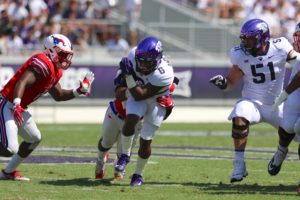 The Horned Frog win wasn’t pretty Saturday afternoon against SMU, but they did more than enough to keep the Iron Skillet in Fort Worth, 56-36. “We scored 56 points, but we didn’t play that well, we had some penalties and turnovers,” TCU head coach Gary Patterson said. “We did what we needed to do since we were the bigger, more physical team and had more experience. It should’ve been 80.” Across the board, Patterson said TCU’s mental preparation wasn’t good enough this week. “I don’t think there was an attention to detail that there needed to be,” Patterson said. It showed on the opening drive of the game when SMU started on offense and the Mustangs executed a flea-flicker pass for a 58-yard touchdown. “They had two trick plays, but the funny thing is we worked on both of them,” Patterson said. “Anything that goes fast that way, stand on the other side of the center and wait for it to come back.” TCU defensive end Ben Banogu admitted that the defense wasn’t completely dialed in on a day in which it allowed the Mustangs to total 36 points on 463 yards. “We got the win, and it is always good when we come out with the victory, but I feel like our defense came out not as mentally ready for the game,” Banogu said. “If we could pay attention to the little stuff and pay more attention to detail, we can find ourselves in a place where we wanna be, but today wasn’t very good.” However, it wasn’t all negative for the Horned Frog defense. They accomplished their goal of limiting SMU’s All-American wide receiver Courtland Sutton who had one catch for no yards. TCU also played stout red zone defense, limiting the Mustangs once they got within striking distance of the end zone, as they forced three red-zone field goals. “I’m proud of the defense again, we played well in the red zone,” Patterson said. “We had three times down there and they kicked two or three field goals. If we can do that in the Big 12, then we have a chance for a lot of success, but you have to get lined up right.” Linebacker Travin Howard returned an interception for a touchdown, and after SMU quarterback Ben Hicks completed his first five passes he looked off-balance the rest of the game, going 12-for-32. Going forward, the defense will need to get off to a faster start, unlike Saturday when TCU trailed 19-7. With better preparation, the Horned Frogs believe improvement will occur. “Starting fast is just preparation,” Banogu said. “Coach P and the staff gave us a good game plan this week, we just didn’t come out ready to play. Honestly, we got punched in the mouth a little bit in the first quarter and we got tricked a little with the trick plays and stuff, but if we can get more focused and be more aware of what’s going on, we will be okay.” On offense, Patterson liked what he saw, but it could’ve been better. Sonny Cumbie’s side of the ball totaled 619 yards. Quarterback Kenny Hill threw four touchdown passes, including a Hail Mary pass to Jalen Reagor to beat the halftime buzzer. Darius Anderson ran for two touchdowns and Kenedy Snell was electrifying on a blazing 71-yard touchdown catch-and-run.