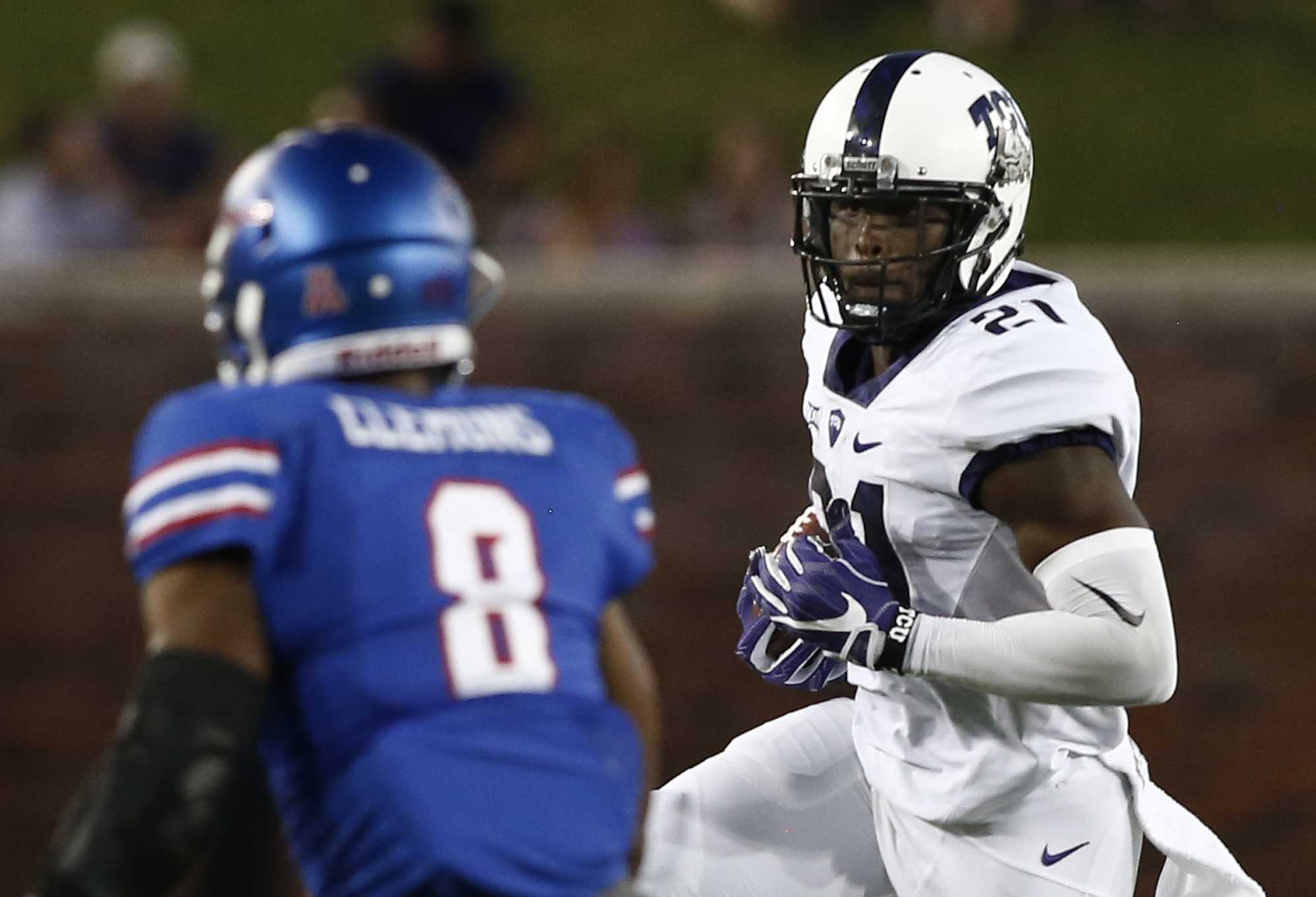 TCU running back Kyle Hicks (21) carries the ball as SMU defensive back Rodney Clemons (8) comes up for the tackle in the first half of an NCAA college football game, Saturday, Sept. 23, 2016, in Dallas, Texas. (AP Photo/Mike Stone)