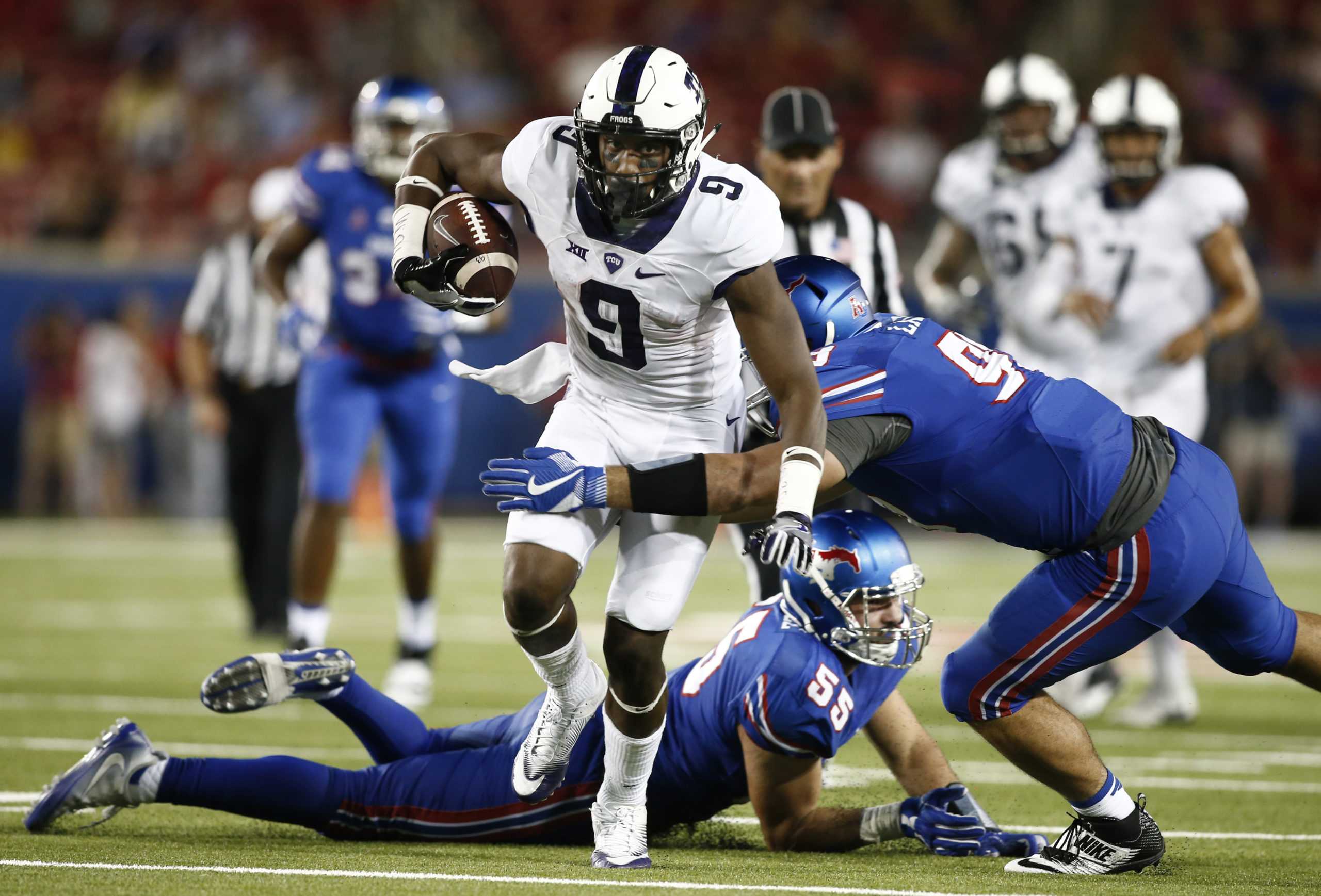 TCU wide receiver John Diarse (9) tries to break loose from SMU defensive end Justin Lawler (99) and linebacker Carlos Carroll (55) in the second half of an NCAA college football game, Saturday, Sept. 23, 2016, in Dallas, Texas. TCU defeated SMU 33-3. (AP Photo/Mike Stone)
