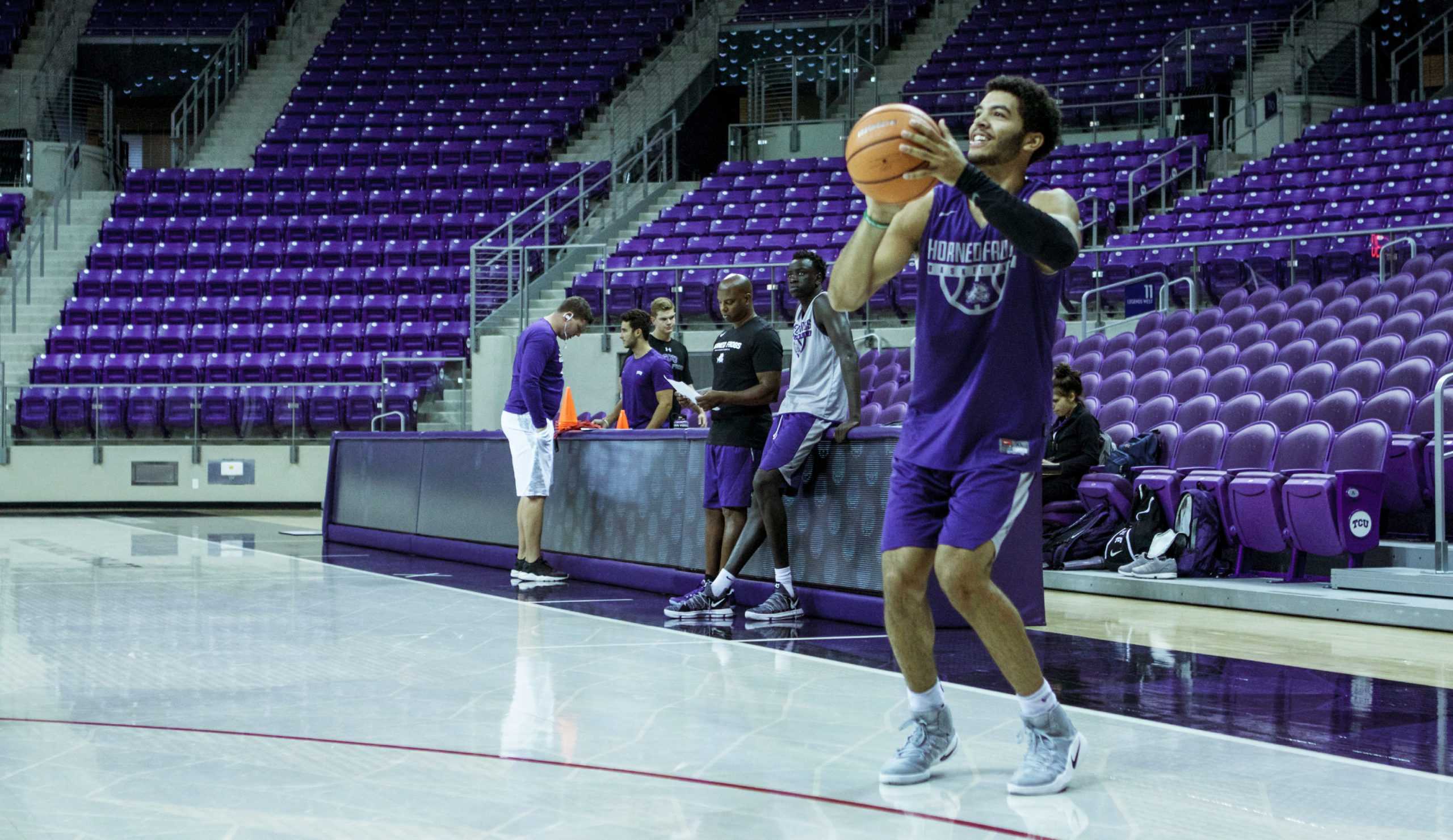 TCU guard Kenrich Williams shoots a three-pointer in practice. Photo by Carolina Olivares