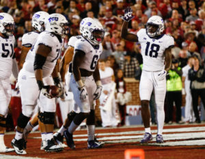 Gary Patterson’s defense entered Saturday No. 1 in the Big 12 in essentially every statistical measure, but none of that mattered to Oklahoma quarterback Baker Mayfield in the first half who tore TCU apart to the tune of 299 passing yards and three touchdowns, scoring 38 points in what-looked like a blowout victory over TCU at the half, 38-14. However, Patterson’s bunch buckled down in the second half, limiting the Sooners to 138 yards and no points in what ended with a 38-20 road defeat. Most of the Sooner signal-caller’s scoring occurred in the first half and was provided by OU running back Rodney Anderson. Anderson earned 203 total yards and four touchdowns, two rushing and two receiving in the first half. “Baker is a good player, and with Rodney Anderson we needed to do a better job of tackling and we didn’t do that,” Patterson said. “They have good players and you have to give their defense credit: we only scored 20 points.” The Horned Frogs also held themselves back in the first half, as they were called for a combined six penalties for 55 yards, including the ejection of defensive end Mat Boesen. OU’s Anderson ripped off back-to-back runs of 30 and 24 yards, the last one going for a touchdown immediately after Boesen’s disqualification. TCU also had their fast play of the night, a five-yard run by running back Kyle Hicks negated by an unnecessary roughness penalty from wide receiver John Diarse. “Can’t hurt yourself with penalties: look at the first series right out of the gate, you can’t let the game get too big and too emotional,” Patterson said. “If you do that, you get yourself in trouble.” Offensively, TCU’s night started out with a lot of promise, as the Horned Frogs took a 7-3 lead over Oklahoma after two plays on its second drive. Running back Kyle Hicks slipped past the Sooner defense on a wheel route for a gain of 62 yards, and running back Darius Anderson punctuated the possession with a 13-yard touchdown run up the middle in which he was untouched. The Horned Frog offense celebrates Darius Anderson’s 13-yard touchdown run in the first quarter against Oklahoma. Photo courtesy of GoFrogs.com Outside of that first possession, TCU accumulated 176 yards the rest of the half for just seven more points, and Anderson suffered an injury just before halftime, as the Horned Frogs entered the locker room trailing by 24. TCU quarterback Kenny Hill said the turning point came early in the first quarter when OU regained the lead, 10-7. “After we missed a field goal and then we went three and out on the next drive, and then they went back and scored,” Hill said of when the game began to unravel. “You know it’s those stops early; we got to put up points early and we got to be able to match them.” After a scoreless third quarter, the Horned Frogs broke the drought with 10:44 remaining in the game on a three-yard touchdown pass from Hill to Hicks that cut the OU lead to 18, 38-20. However, TCU failed to pick up the two-point conversion that could’ve made it a two-possession game. Defensively, TCU looked like the conference’s top defense in the final 30 minutes, keeping Mayfield and company off the scoreboard. “I told them at the half you have a choice: either we were going to come out and play or we were going to scrimmage tomorrow and if they didn’t want to play, we were going to put pads on and have a scrimmage,” Patterson said. “Obviously, we did a little bit in the second half: they started with 38 at halftime and ended the game with 38, so I was proud of our guys they did that because it’s not like they sit on the ball.”Injuries TCU kicker Jonathan Song, who is a perfect 8-8 on field goals this season, was on the sideline Saturday, but he didn’t kick against the Sooners. “Jonathan Song couldn’t go, and he couldn’t kick Thursday for whatever reason,” Patterson said. “So we brought him, and we thought he maybe could tonight, but he couldn’t, and we’re back to the kicking extravaganza.” Horned Frog running back Darius Anderson suffered a lower-body injury in the second quarter and did not return to action. Patterson said it was doubtful that Anderson would play against Texas Tech and Baylor, TCU’s last two opponents in the regular season. “He’s a big part of our offense, and when he touches the ball he can go the distance,” Hill said of Anderson. “But you know people got to step up; Kyle and Sewo will be ready to go, plus Snell will get some looks at practice. We just have to have someone to step up.”Up Next: TCU heads to Lubbock next for a matchup with Texas Tech while firmly entrenched in second place in the Big 12 standings after Iowa State’s loss at home against Oklahoma State. Provided the Horned Frogs win out, they could see the Sooners again this season in the Big 12 championship game December 2. “If we win our next two ball games, we have a possible opportunity to play that team again, but that starts with Texas Tech,” Patterson said. “Here we go.” The Horned Frogs head to Lubbock, TX to face the Texas Tech Red Raiders Saturday. Kickoff is set for 11 a.m.