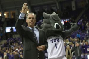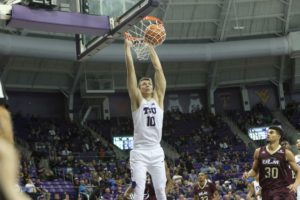 Jamie Dixon received two birthday presents Friday at Schollmaier Arena as the Horned Frogs were given their NIT championship rings and defeated Louisiana Monroe in a game that was a little close for comfort, 83-73. “A lot of fun before the game as far as getting the rings, well deserved, but we are moving on, getting back to the game, Lousiana Monroe shot well, 12 three’s,” TCU head coach Jamie Dixon said. For a team that won nine games last season, the Warhawks kept themselves within striking distance with their performance behind the arc, hitting on 44.4 percent of its three-pointers, 12-27 on three-point shooting. “I thought we could’ve done a better job defending, but hopefully this was a good learning lesson for us in that regard,” Dixon said. The Horned Frog defense played well, blocking four shots and winning the battle down low by out-scoring ULM in the paint 46-22 as well as out-rebounding the Warhawks 40-35, but Dixon said ball pressure must improve. “Getting into the basketball, our ball pressure was the disappointing part, and that’s what we’ve been preaching recently,” Dixon said. “We knew it wasn’t good enough and they may believe it now.” Offensively, Kenrich Williams picked up right where he left off last season, notching a double-double with 13 points and 14 rebounds, while also pacing the Horned Frogs with seven assists. It was Williams’ sixth-straight double-double dating back to last season when he had a double-double in each of the five NIT games to conclude the season. “It was an ugly win, but we got the job done,” guard Kenrich Williams said.”I’ll do what I do.” Senior forward Vladimir Brodziansky led the Horned Frogs in scoring with 16 points. It was the 22nd time in his career that he’s paced TCU in scoring.