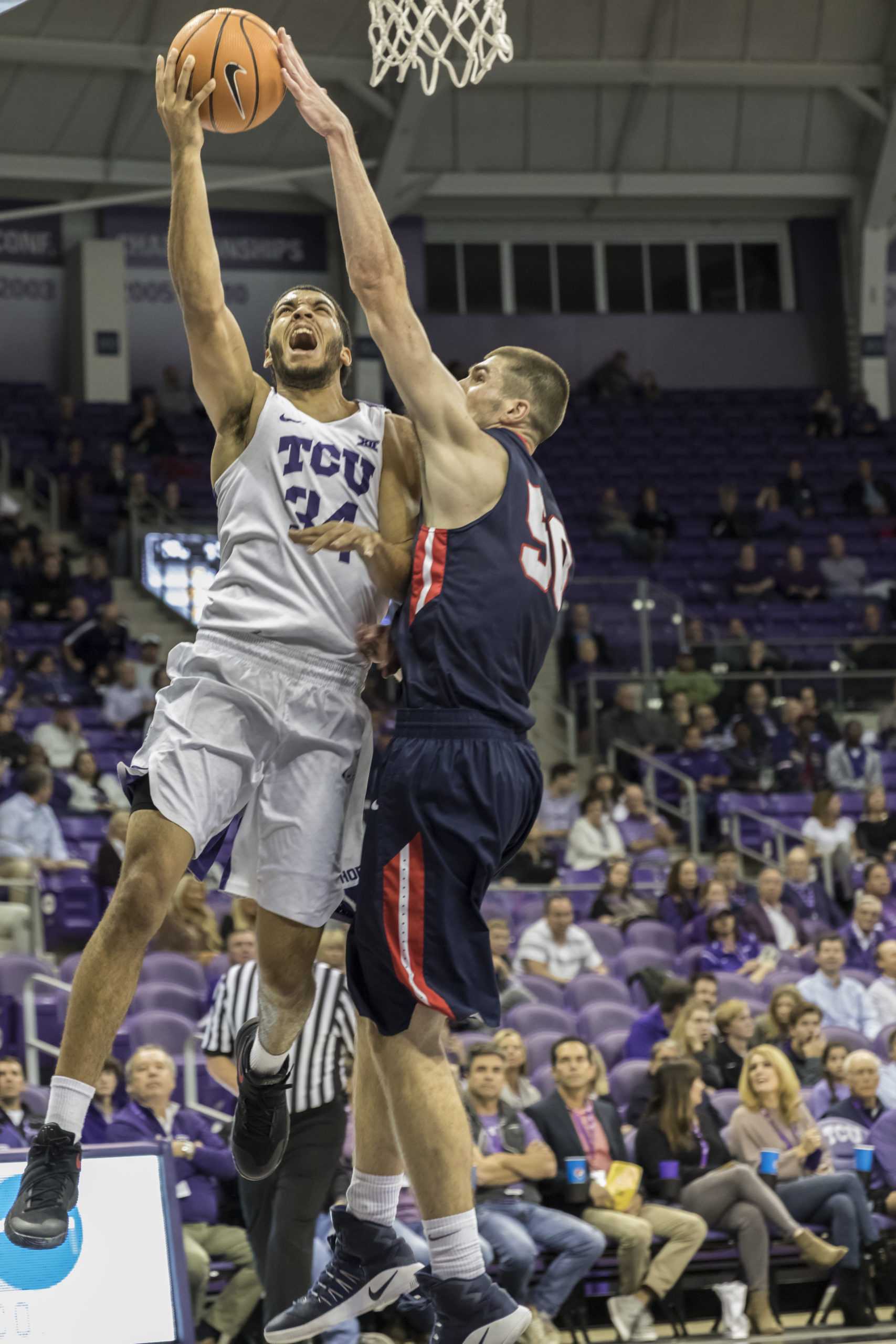 No. 23 TCU men’s basketball won for the first time as a member of the AP Top 25 this season, utilizing early runs of 11-2 and 20-4 to triumph 87-76 Wednesday at Schollmaier Arena. TCU forward Vladimir Brodziansky was the catalyst for the first scoring strike, hitting three three-pointers consecutively in under a minute and finishing with a game-high 22 points, including 17 in the first 20 minutes. The Slovakian hit a career-high five three-pointers on six attempts. “I was just trying to help the team because I was open and they kept going in,” Brodziansky said. “My teammates just tell me a lot to shoot them, and they tell me don’t think about it, just shoot it.” TCU forward JD Miller said Brodziansky’s hot hand usually leads to a desirable outcome for the Horned Frogs. “When Vlad’s hitting three’s like that, we’re going to do good throughout the game,” Miller said. “We have to close-out a little better than we did defensively.”TCU forward JD Miller finishes around the basket against Belmont forward Amanze Egekeze. Photo by Cristian ArguetaSoto After the Bruins clawed back, cutting the Horned Frog lead to five, 19-14, TCU put their foot on the accelerator, ripping off 15 unanswered points from the 10:43 mark to the seven-minute mark. The run gave the Horned Frogs a 20 point lead, 34-14, powered by a Kenrich Williams three-pointer, an Alex Robinson four-point play, a JD Miller lay-in, a Vladimir Brodziansky and-one finish and a Jaylen Fisher and-one lay-in. A significant factor in the sustained offensive success for TCU was its mistake prevention. The Horned Frogs committed just 11 turnovers, its fewest this season. “We got the turnovers back down,” Dixon said. “We really emphasized that the last two days, and guarding the three.” The Horned Frogs moved to 7-0 and extended a winning streak to 12 games dating back to last season when they won five-straight games on the way to the NIT championship.
