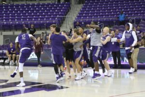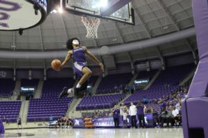 “It’s big to see the love and passion that these fans bring to surround the TCU basketball program with,” sophomore guard Desmond Bane said. Bane took home the slam dunk contest over freshman guard RJ Nembhard, and senior guard Kenrich Williams won the three-point contest, but the biggest winners of the night were sophomore point guard Jaylen Fisher and sophomore Jack Spooner. Desmond Bane participates in the dunk contest while wearing a Bane mask. Photo by Carolina Olivares Fisher suffered a meniscus tear in his knee August 3 and was cleared to resume this week. “Jaylen and I talked about it over the summer, and we dreamed of times like this, being able to play in front of all these fans and for him to be able to be healthy and return to play in something like this is big for him,” Bane said. “He played great.” Spooner was one of three students who had the privilege to choose anyone off the TCU basketball roster to shoot a half-court in their place to win them 1,000 dollars. He choose senior forward Austin Sottile, who averaged 0.5 points in 2.1 minutes per game after appearing in 12 contests last season. Sottile released a line-drive shoot that hit nothing but the bottom of the net, earning Spooner a check for $1,000. Why did Spooner choose Sottile? A hometown connection. “He’s the pride of St. Louis basketball,” Spooner said, a native of St. Louis himself. “I’m feeling awesome.” The team celebrates after senior forward Austin Sottile drains a half-court shot to win a student $1,000. Photo by Carolina Olivares The Horned Frogs have plenty to feel awesome about coming off a 24-15 season, winning the program’s first postseason championship, the NIT. With the return of their top six scorers, the Frogs were selected to finished third in the preseason Big 12 coaches poll their highest spot ever. Now, the Horned Frogs have the expectations of a basketball school: NCAA Tournament “We’re looking forward to big year and hopefully we can make a run and get into the NCAA Tournament,” Bane said. TCU begins its season Nov. 10 with an 8 p.m. tipoff against ULM at Schollmaier Arena.