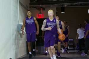 “It’s a start, we’re headed in the right direction, and there’s a lot of excitement about the program and the team this year,” TCU head coach Jamie Dixon said. It’s another step in the right direction for a program that hasn’t reached the Big Dance in two decades. Yet, Schollmaier Arena was abuzz the entire from the scrimmage all the though the half-court shooting contest at the end of the night. Jaylen Fisher (0) and Desmond Bane (1) lead the Purple out onto the court. Photo by Carolina Olivares Students have begun to feel the difference.