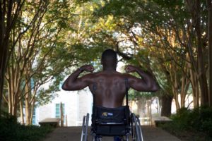 Devon Berry loves playing sports. During his freshman year at St. Cloud State University in Minnesota, he joined the collegiate wrestling team.Berry then decided to transfer to TCU in the fall, citing the main draw as the reputation of the Neeley School of Business.The TCU sophomore faced a challenge playing sports the other athletes didn’t: he was born withcerebral palsy, a neurological disorder caused by a malformation in the brain that primarily affects body movement and muscle coordination. Berry’s legs do not function properly, and he had undergone nine surgeries by the age of nine. Berry now has a new goal: to qualify for the 2020 Paralympics.“It’s not about my disability; it’s about the ability that God gave me,” Berry said regarding his athleticism and potential.Berry is double majoring in entrepreneurial management and marketing and minoring in finance. He’s also the author and publisher of Facing your Fears: The Devon Berry Story.“People often tell me I can’t do things,” he said. “You can’t be the greatest without failing.”Devon Berry flexing as he strolls through campus. (Photo Courtesy: Kennedy Harvey)Berry has been proving people wrong for his whole life. Berry said he can either look at it pessimistically or optimistically, and he chooses the latter.Berry started meeting with a trainer about two months ago. They meet every other week.“My trainer told me he doesn’t think I have the skillset to qualify,” Berry said. “ I’m determined to prove him wrong.”Paul Johnson is his trainer and a volunteer coach for the track and field Paralympics team. Johnson works with Cathy Sellers, director of Paralympic track and field at the United States Olympic Committee.Berry said Johnson has helped him mentally prepare for what it’s like to compete at that stage.“He’s often been very honest,” Berry said. “We’ve had a lot of real conversations.” He added that Johnson told him he would need to find someone to sponsor him because there isn’t a wheelchair team for the decathlon.So he did. Berry has contacted Adidas, and he just met with Nike’s president of geographies and sales, Elliott Hill, who is also a TCU alum.Devon Berry with Elliott Hill, president of geographies and sales for Nike.Berry wears a leg brace on each of his shins and is currently designing a sports leg brace for optimal range of motion and better athletic performance so that he can compete to the best of his abilities.“What the sports leg brace is going to do is be able to rotate according to the ankle and leg, and allow the athlete to compete with it,” Berry said. “You can compete with this right now, but it’s stiff. It’ll not only allow me to walk, but it’ll let me run, specifically for sports.”Berry is currently working with the TCU IdeaFactory on creating a prototype for the sports leg brace.For the next two years, Berry will be training for the Paralympics.“In two full years, you never know what can happen,” he said. “You can explore talents that you never thought you could have.”