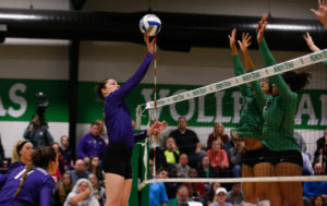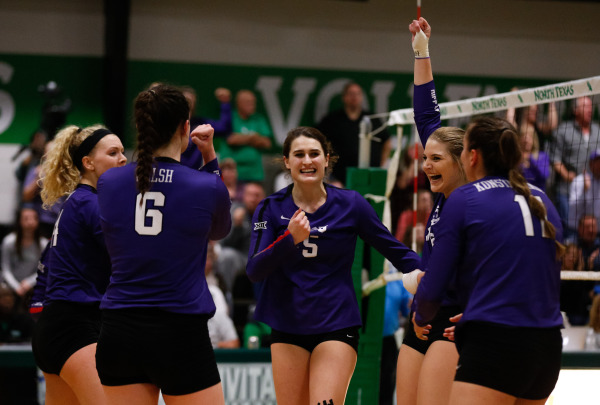The Horned Frogs conquered a hostile environment and a scrappy North Texas team in Denton Friday in five back-and-forth sets to advance to the National Invitational Volleyball Championship Elite Eight, 3-2 (24-26, 25-21, 23-25, 25-23, 15-10.) “I’m proud of them for sticking it out because there were times where we got down and we fought back,” Director of Volleyball Jill Kramer said. “There were times we were up a lot and we let them in, we didn’t let of that phase us, and we stuck with it the whole time and just kept fighting.” TCU received All-Big 12 selection Anna Walsh’s best performance with a career-high 25 kills, outside hitter Lexi Maclean contributed 14 kills, and Thursday’s top player Abigail Buckingham had 10 kills. Senior setter Lamprini Konstantinidou had a team-high 25 assists, and first-year setter Tori Dilfer delivered 19 assists. TCU middle blocker Anna Walsh hits over the North Texas front row. Photo Courtesy of GoFrogs.com Walsh contributed her success to her teammates. “I’m so proud of Tori [Dilfer],” middle blocker Anna Walsh said. “Stepping into this role as a freshman and a setter can be difficult, but she’s mentally tough and I’m proud of her, and of course I love Prini. I was telling Jill [Kramer] that as a middle especially you can’t get anywhere without your passers or your setters, so shoutout to them for passing shots I could nail and getting me the ball.” The Horned Frogs and the Mean Green battled back and forth for the entire first set until North Texas started to gain some separation, leading by five as the frame was winding down, 22-17. However, TCU battled all the way back, winning seven of the next nine points, to send it to a win-by-two situation. The Horned Frogs were unable to earn a set point, and UNT finished the first set off in their third set point opportunity on a kill from first-year outside hitter Barbara Teakell, 26-24. The Horned Frogs raced out to a significant lead in the second set, as they lead by six, 20-14. However, UNT clawed its way back, cutting the TCU advantage to just one, 22-21. TCU weathered the storm, winning the next four points to tie the match at a set a piece, 25-21. TCU built another six-point lead midway through the third set, 14-8, but it wouldn’t last. The Mean Green roared all the way back to tie the set at 22, and then UNT finished off the third on a kill by Wright, 25-23. TCU bounced back in the fourth set, as they possessed a couple four-point leads, 7-3 and 13-9, but the Mean Green climbed back to tie the set at 17. After UNT took a two-point lead, 22-20, TCU won five of the next six points to tie the match after a couple of Buckingham kills to close it out, 25-23. With each team winning two sets, the Round of 16 matchup went the distance: a winner-take-all fifth set to 15. The Horned Frogs took an 11-5 lead and never looked back, winning the final set, 15-10, with the final kill coming from Walsh. Kramer said her team’s mental outlook had a lot to do with the winning result. “I said to Anna what a performance by you, and she said yeah we were not going to lose this match,” Kramer said. “We came into this match all day thinking we were going to get it done, and I don’t think they ever let that leave their minds. You can’t make unforced errors in fifth sets and expect to get it done. I think they managed the game really well. Their head was in the right place.” TCU also had to deal with a “drastic” atmosphere shift in between Thursday and Friday, matching up against a Wyoming team that traveled across the country in Round 1 to playing a North Texas team taking the court in its own gym in Round 2. “I think Big 12 has pretty crazy atmospheres, so that helps prepare us,” Walsh said. “The change can be drastic, but I think as a team we feed off that. A crazier crowd was one of those challenges, but I think we were prepared for it.”Up Next With the win TCU’s season returns to Fort Worth for the next two rounds of the NIVC. “We love home, so of course that’s fun,” Walsh said. “We love our fans, we love them to death, so we’re excited to play in front of them.” TCU hosts Green Bay at 7 p.m. in a NIVC quarterfinal match Wednesday at the University Recreation Center.