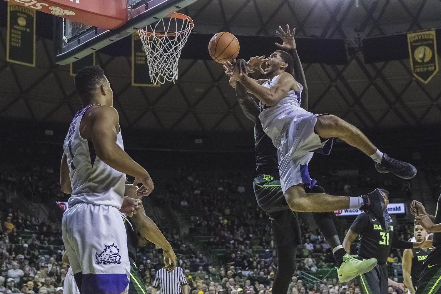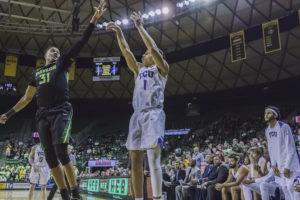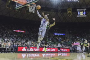 The Horned Frog men’s basketball program continued its path into uncharted territory under head coach Jamie Dixon Tuesday, this time with its first win in Waco over rival Baylor since 2002, winning in overtime 81-78 to snap an 11-game losing streak against the Bears. “Welcome to the Big 12, every game is going to be like this, obviously we lost a one-pointer with a one-point lead and this time we had a 12-point lead, and they fought back and battled as you might expect,” TCU head coach Jamie Dixon said. “I’m proud of our guys and how they fought through it.” After losing a 12-point edge that the Horned Frogs built just over a minute into the game, it looked as though déjà vu from their one-point loss to Oklahoma was going to strike TCU once again. “We have to address how when we have 12-point, 13-point lead, and teams get more aggressive so we have to respond to it in a better way and finish it out,” Dixon said. “That’s a big thing we can take from it.” Baylor slowly chipped away at the TCU, as the Horned Frogs lead by eight at the break, 36-28. TCU shot 50 percent from the floor, including 4-of-9 on three-pointers in the first half, while the Bears couldn’t hit from distance in their first six attempts. The rebound edge was dead even at 16, but that was about to change. Lual-Acuil Jr. pounded TCU down low all night, scoring a game-high 28 points to go along with 11 rebounds. “He’s a tremendous player on the low-block, he’s hard to stop with the jump hook over the left shoulder,” TCU forward JD Miller said. “We just tried to maintain him.” His frontcourt partner Terry Maston added 20 points and nine rebounds. The Baylor tandem caused a number of Horned Frogs to suffer from foul trouble as Ahmed Hamdy fouled out with 11:03 left in regulation with Vladimir Brodziansky and JD Miller saddled with three and four fouls respectively. After Baylor evened up the contest at 64 with 17 seconds left to play, the Horned Frogs opted not to call a timeout and wound up with a Desmond Bane three-point attempt to beat the buzzer that bounced off the front of the rim following a Vladimir Brodziansky kick out of a double-team. TCU guard Desmond Bane attempts a three-pointer against Baylor. Photo by Cristian ArguetaSoto“It’s a wide-open three by our best shooter, and I didn’t call a timeout because I didn’t want them to set up their defense, but you take a wide-open by your best shooter, we did what we needed to do,” Dixon said. “We got an inside touch, and sometimes they don’t go, but we don’t blame or question because we continue to do the right things.” Bane finished with 10 points against the Bears and had a career-high six assists as well as tying his career high in steals with three. Once overtime began, it was clear what the Horned Frog offensive approach was: pound the paint. Brodziansky scored nine of TCU’s 17 extra session points. JD Miller shoots a finger-roll at the rim against Baylor. Photo by Cristian ArguetaSoto Brodziansky led TCU in scoring with 18 points, and Miller had 13points against Baylor. The Horned Frogs capped their first Big 12 victory with a Kouat Noi breakaway dunk that put TCU up five with 12 seconds to play. TCU forward Kouat Noi punctuates the Horned Frog victory over Baylor with 12 seconds left to play. Photo by Cristian ArguetaSoto“That put the stamp on it right there, and we got the W in Waco, feels good,” TCU guard Kenrich Williams said. The victory was extra special for the Horned Frogs’ do-it-all guard who is a Waco native and attended high school at Waco University. “I can’t even explain the feeling, I’m just thanking the guys in the locker room because I haven’t beat Baylor and every time we come back here the previous three years we’re getting beat by 20 so to get this win like they did I appreciate it,” Williams said. Williams said he had roughly 25 family and friends at the game. A key factor in TCU’s road win was its work at the free throw line to close the game: The Horned Frogs shot 10-for-10 at the line in the final four minutes and overtime after starting 7-for-15. TCU forward Vladimir Brodziansky shoots a free throw against Baylor. Photo by Cristian ArguetaSoto While the Horned Frogs lost the battle down low, getting out-rebounded by 11 (45-34) and out-scored in the paint by 14 (52-38), Dixon liked how his team took care of the ball, losing the ball just 11 times to Baylor’s 14. TCU scored 15 points off the 14 Bear giveaways. “We have to finish a little better around the basket, but only 11 turnovers on the road in a 45-minute game,” Dixon said. “The biggest thing I like about this group is what we’ve done turnover-wise.”Up Next No. 16 TCU’s next challenge is hosting No. 10 Kansas in Fort Worth. The Jayhawks have won the last 13 Big 12 regular season titles and will be looking to avenge their first Big 12 loss after a 12-point home defeat, 85-73, to Texas Tech. Tip-off at Schollmaier Arena is set for 8:15 p.m.