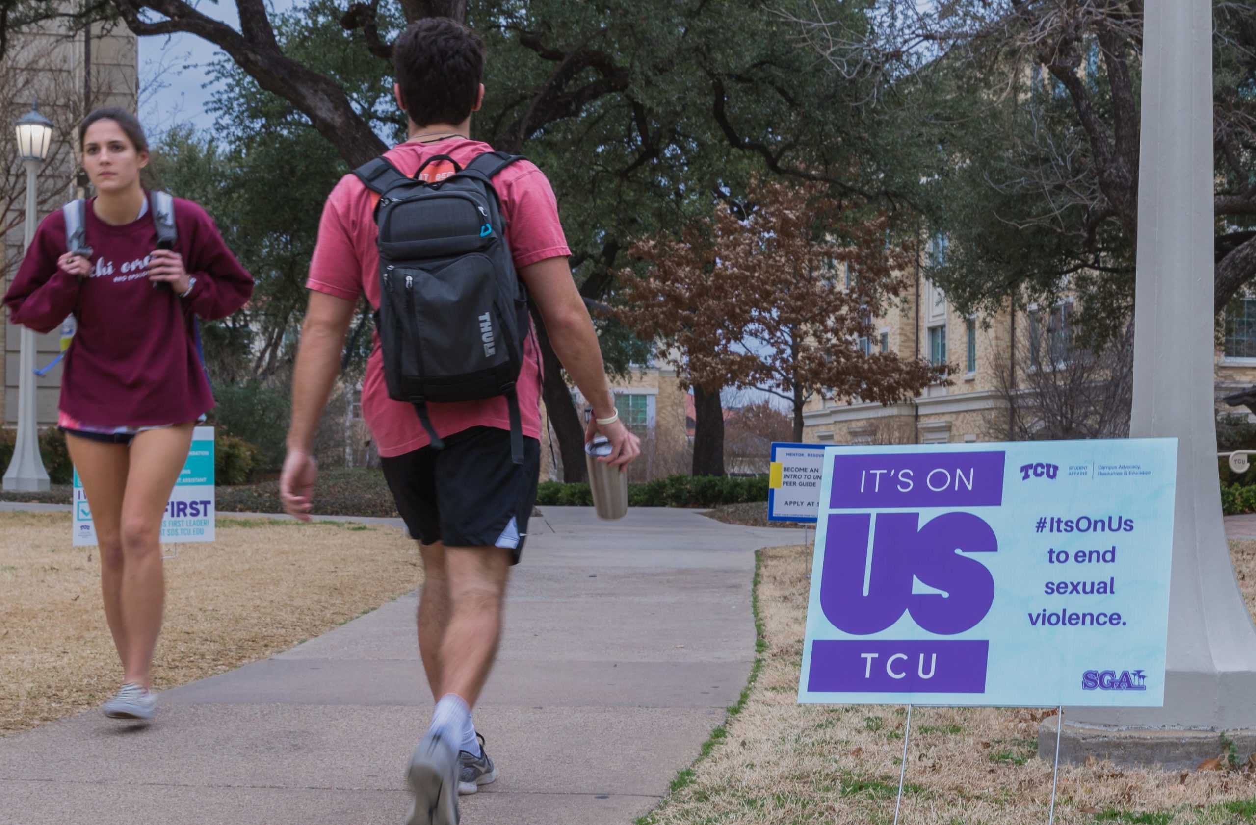 Students walk past one of many “It’s on Us” posters on campus. Photo taken Feb. 19 in Fort Worth, Texas by Cristian ArguetaSoto.