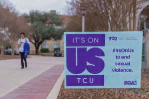 Two years ago, the SGA changed the name of their sexual assault prevention campaign from “Not on My Campus” to “It’s on Us.” The goal of nation-wide prevention initiative is to empower people to understand it’s on every single person to stop sexual assault and empower victims, according to Student Body Vice President of Operations Abbey Widick. “The heartbreaking truth is it is on our campus and it’s on college campuses around the nation,” Widick said. “The ‘Not on My Campus’ message implies that it’s not a problem here and that we are above that. That’s an unfair message. This social awareness campaign sets the culture that sexual violence is absolutely not tolerated on our campus.” SGA received scrutiny from sexual assault survivors with the “Not on My Campus” initiative, Widick said. In order to increase campus involvement, SGA created a full “It’s on Us” week to combat sexual assault. The events began Monday with a banner signing at the Brown-Lupton University Union. Signs supporting the movement can be found all over campus. (Photo by Cristian ArguetaSoto.) Students walking to Market Square for lunch were greeted by Widick and fellow SGA members, smiling from ear to ear and asking students to sign a banner. Many students also wrote the three simple words, “It’s on Us,” on their hands to support victims of sexual violence which were shared through the SGA’s Facebook Page. More than 800 students signed the banner. Widick introduced the initiative along with Kat Nestor, director of sexual assault prevention and awareness. As director, Nestor is in charge of coordinating the events that occur throughout the week. Nestor also serves as a resource for victims. For Widick, going forward with the initiative was a no-brainer. “Any issue that prevents someone from having the full TCU experience needs to be addressed,” Widick said. “Whether that’s struggling with mental health or a sexual assault that they had in the past. It’s an incredible opportunity to establish the culture that sexual assault is not allowed in any way here and to help empower victims that they matter and their story matters.” Nestor said she wanted to go forward with “It’s on Us” this semester from hearing the stories of many victims across campus. “It’s not an easy thing to do,” Nestor said. “Especially on TCU’s campus which is so dominated by social culture. It’s all about fitting in and having a lot of friends. I think people are afraid to be vulnerable, so when people are vulnerable in a community like this it speaks even louder volumes.” According to the nation-wide “It’s On Us” data, 11 percent of all students experience rape or sexual assault during college. However, only six percent of college student body presidents believe that rape is a problem on their campus, according to FiveThirtyEight. “Those are heartstopping statistics,” Widick said. “This is something we need to actively address and the first step to improving something is realizing and recognizing it’s a problem.” Widick said there are two different facets of outreach: movement and bystander intervention training. The movement aspect happened by taking pictures and SGA hosted a bystander intervention training dinner Tuesday night to teach tips to listen, believe and support victims. Wednesday night featured a men’s sex and healthy relationships workshop. The events ended Friday with a keynote presentation on relationship violence by TCU’s Title IX Victim Advocate Leah Carnahan. A senior communications studies major and sexual assault survivor, who asked her name not be used, is grateful the university acknowledges the issue of sexual assault but wishes the university took greater steps. “They should do more than post about it on social media,” she said. “I think they should remind students about the issue once every month. It wouldn’t be too difficult and people may become more passionate about it.” She also suggested that all students should attend a mandatory meeting on sexual assault prevention. By forcing the idea onto students for one week only and forgetting about it for the rest of the school year not a lot of progress is made, she added. Two other schools in the Big 12 conference are involved with “It’s on Us:” The University of Texas and West Virginia University. Nestor said that TCU’s version stemmed from both schools. “Last year was the pilot year for ‘It’s on Us,'” Nestor said. “There were logistical things we needed to figure out. People weren’t completely sure what it was but this year we’ve been able to talk to a lot of other schools.” Widick said she was proud of the student body by the way they took part in the campaign. “I have felt very grateful for the way this community has approached this from trying to do everything they can to stop the problem,” Widick said. “I would love to keep this momentum going to be powerful bystanders against sexual assault.” Nestor and Widick had one goal for this week: placing the power in the survivor’s hands. “If we can help one person feel that they’re not alone and that their community believes them, then we’ve done our job,” Nestor said. “It would be great to have more than one person, but we should let people know that this is a community where they’re safe to share, encouraged to get help and will not be judged if they don’t choose to proceed with legal action.”
