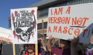 A 1933 news article quoting former Boston Redskins team owner, George Marshall, on the name decision. Credit to Hartford Courant.The 1898 1st edition of Merriam-Webster’s, the Collegiate, defines “redskin” as “A North American Indian; ––often contemptuous.” Over time the definition has evolved but as of 2003 the 11th edition defines it as “usually offensive.” Redskins fans interviewed in the film said the team name is not meant to be offensive and the possible name change is only being debated because society wants to be more “politically correct.”Sophomore business major Gabe Lemon agreed: “Native Americans should be grateful that they are being honored.” Sophomore business major Michael Lloyd said he viewed the mascot as a homage to the team’s fight in each game. “I am against change in general, the mascot is iconic and shows power,” Lloyd said. “The Redskin is another image as a warrior as what represents the team’s grit and strength.” Others said the bravery of Native Americans had nothing to do with sport. They faced rampant racism so they handled those situations as moments of honor, said Diana Parton, a citizen of the Cato nation and a descendant of the Yuchi nation who attended the screening. “They are survivors of the war and we are not,” Parton said. The film took the audience through a time when the Washington team had a group of Native Americans attend a halftime show in honor of their culture. Many argued that if Native Americans don’t like the mascot then they should not attend these events. Napa High School students protesting in favor of the removal of the Indian mascot. Photo courtesy of San Francisco Bay Area Independent Media Center. But researchers have found that staying away may not be the solution. Images of Native Americans mascots result in harmful psychological effects, according to “The Harmful Psychological Effects of the Washington Football Mascot,” compiled by Michael A. Friedman, Ph.D. “Not only do mascots have a direct effect on Native American self-esteem, mood, community confidence and sense of achievement, but they also perpetuate negative associations of and attitudes towards Native Americans among non-Native American groups,” according to Friedman’s research. Parton said people should see the issue as more of a community-wide effort regarding mental health. “To address the stereotype issue I would encourage all parents to understand what the use of a stereotype, in general, does to the psyche of the people that are exposed to it,” Parton said. She said a suggestion would be to take away the race aspect and focus on the issue of mental health. First-year student Austin Merkel said he supports the mascot change because it would be positive for the people that find it offensive and he would continue to support the team. “I think it could be an opportunity to make the team more of something that everyone, including Native Americans who are offended by the name, could root for and rally around for,” he said. Merkel said he hopes the team keeps the current colors and finds a new name such as the Redhawks because if implemented correctly the new name could create excitement around the franchise and lead to a potentially bigger, more passionate fan base. Dr. Scott Langston, a professor of religion, who helped organize the film screening, said he hoped to bring more awareness to the obstacles the Standing Rock Sioux tribe face. “Listen to native peoples,” Langston said. “Learn from them, follow their lead and respect their cultures that provide serious answers to many of the problems our society has today.”