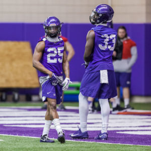 During the search to find Kenny Hill’s replacement as the next Horned Frog quarterback, TCU head coach Gary Patterson has found the position group to be as deep as its ever been. “Best first two days of spring we’ve had in two years,” Patterson said of his quarterbacks. “All three probably spinning it better the first two days of the spring than we have in two years.” Shawn Robinson, who played in six of TCU’s thirteen games as a true freshman, including a win in his only start in Lubbock against Texas Tech, is the likely starter Patterson said, but Justin Rogers and Penn transfer Michael Collins have also impressed. “Shawn Robinson is probably the leading candidate because he’s started a game and won it,” Patterson said. “He’s been here and learned how to manage and prepare for a ball game during the week. The best part about that was I don’t think he understood what to do. You go into Lubbock to play a ball game as the starting quarterback, that’s hard to do. He threw the ball well, missed a couple routes, but found a way to win the ball game.” The sophomore, a state champion at DeSoto High School, gained what Patterson said is something you can’t teach when he accounted for 169 total yards, 84 of which came on the ground against the Red Raiders, experience. “I think what he learned out of it was that the preparation is a lot of work and you need to get down,” Patterson said. “You can’t run over everybody even if you’re 220. Everybody has big guys so you have to be able to get down.” While Collins doesn’t have the name-recognition of Robinson or Rogers, the highest-rated recruit during Patterson’s time in Fort Worth, he could earn the back-up job and stay in the hunt for the top spot until the very end with Rogers’ on the mend, recovering from a knee injury he suffered in high school. TCU offensive coordinator Sonny Cumbie coaches up quarterback Justin Rogers (13). Photo by Cristian ArguetaSoto After the conclusion of spring practice number five Thursday and the first full pads practice of the semester, the Ivy League transfer still has a ways to go. “I only judge quarterbacks in scrimmages and games, so there are days where you’re killing it and some days you’re not,” Patterson said. “Today we worked first down, third down, zone and man blitz, so for a new guy it’s a lot of work. That’s why we push the issue all the time.” However, whether it’s Robinson, the most likely scenario, Collins, or Rogers, it’ll be a work in progress with the offensive line in front of them losing four of its five starters from a season ago. “Again, Robinson’s deep in alligators because the thing about running back and quarterback here is your confidence level goes with the experience of your offensive line, and right they’re a work in progress,” Patterson said. “We’re on day five or six, we just need to keep getting better. There are three rotating in at left tackle.” However, whoever becomes the TCU signal-caller will be lavished with a talented wide receiver group Patterson said with Jaelan Austin and Jalen Reagor at X and Z positions on the outside, Jarrison Stewart inside at the Y position, and KaVontae Turpin and true freshman Taye Barber at H inside the slot. “We look more explosive at the wide receiver position and at quarterback especially throwing it deep than we have in a couple years.”TCU wide receiver KaVontae Turpin (25) and running back Sewo Olonilua (33) talk in between drills. Photo by Cristian ArguetaSoto Specifically, Barber has drawn a rave reviews early this spring. “Our off-season hasn’t bothered him at all, the learning process hasn’t bothered him at all, going to school hasn’t bothered him at all,” Patterson said. “He’s one of those guys where you just smile when you talk to him because he’s been a perfect child. What else can you ask for? If everyone did that it would be a lot easier on us.” Patterson said former TCU receiver and 2017 Alamo Bowl hero Desmond White was fast, but Barber is even faster. Barber, a graduate of Cypress Springs in Houston, runs a 4.53 40-yard dash while White ran a 4.68 40-yard dash coming out of DeSoto in 2014. Barber, at 5-foot-10, 183 pounds, is four inches taller and 40 pounds stronger than White when he as a true freshman.