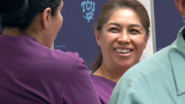 Rickel 243 is a typical learning space at TCU, but for an hour every Wednesday and Friday students are the teachers and TCU employees are the ones taking notes. Twelve of TCU’s Spanish-speaking employees were selected by their supervisors to partake in a six-week intensive English program. After they clock-out from work, these employees meet to practice their pronunciation, perfect their grammar and master the phonetics of the English language. Five students from the John V. Roach Honors College serve as speaking partners in the program. As a part of their honors communicating effectively class, they were tasked with a project — the main goal of it being to change the world. The students decided the best way to go about it was to try to increase literacy on campus. “We wanted to start a program where staff would feel comfortable to get help and practice their English with [people] who are really passionate about wanting to help them learn,” Victoria Becker, a first-year strategic communication major and speaking partner, said. “There are so many opportunities that are missed out on because there is a language barrier.” Becker, along with the four other students, primary role is to facilitate conversations in English with the employees. “For the first half of class, we roam the classroom and help students struggling with any concept,” Mark Lillard, a first-year pre-business and Spanish double-major and speaking partner, said. “For the second half, we break up into small groups, with each of us leading a group. We foster discussion in the groups and find ways to relate the lesson to their personal and work lives so that they may begin using their new language skills right away.” Although Becker and Lillard can understand Spanish, some of the other speaking partners have a very restricted comprehension of the language. Allie Benson, a first-year political science and psychology double-major and speaking partner, said that even though she speaks a little Spanish, she is able to help students with things such as their English pronunciation and syntax structure. “I would still consider myself a beginner,” Benson said. “I can understand most of what they are saying in Spanish, but I answer them in English. This is beneficial for both me and them because I can practice my Spanish while they are learning English as well.” The students said the use of English helps to immerse the employees even more. “It is very tempting to try to communicate [in Spanish] because that would be easier for them and we could understand what they mean,” Becker said. “It is a challenge for them to be completely in English, but it gives them a real sense of what it’s like to be in an English intensive environment.” One TCU employee and student in the course, Irma Lomas, said that although things such as reading, grammar and writing don’t come naturally to her, she is working to increase her skills. “I want to learn English to communicate more with the people, with my supervisor and with everybody,” Lomas said. Lomas moved from Chihuahua, Mexico thirty years ago and has worked at TCU as a housekeeper ever since. Even though she has lived in the United States for three decades, she said she gets nervous when she tries to speak in English. “When the teacher asks me questions I say, ‘Oh my God … will it be all right? Will it be wrong?’” Lomas said. “It is very important to learn English because I can communicate more with my daughter, with students from here at TCU, with many people.”
