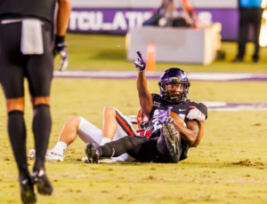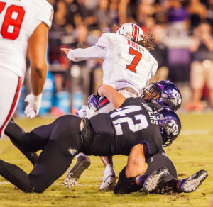TCU Football limited the Big 12’s top offense to just below 250 yards, but the inability to create consistent offensive firepower gave Texas Tech the edge, 17-14. “We only have one person to blame and that’s me,” said head coach Gary Patterson. “I allowed two big plays. They did a nice job, got to give them credit. That’s an explosive offense.” Despite leaving the Iowa State game two weeks ago with a shoulder injury, Patterson decided to start sophomore quarterback Shawn Robinson. Shawn Robinson threw for two touchdowns and one interception two weeks removed from his shoulder injury. Photo by Cristian ArguetaSoto. Robinson passed for 290 yards and two touchdowns while also rushing for 51 yards on seven attempts. Texas Tech chose quarterback Jett Duffey to run the show and his versatility proved difficult for the Horned Frogs’ defense to match early in the contest. Duffey ran for 23 yards, broke multiple TCU tackles and accounted for 28 yards through the air on their first drive. “You can’t make every play on the field,” said defensive end Ben Banogu. “The one thing you can do is learn from them and try to execute to the best of your ability. The moment that we stop having effort out there and stop executing, that’s when we stop playing football.”TCU’s defense held the Red Raiders to well below their season yardage average. TCU vs TTU. Photo by Cristian ArguetaSoto. Duffey finished the game with 89 yards rushing for one touchdown and passed for 190 yards and a touchdown through the air. He played every drive but the first of the second half. The Red Raiders broke the scoreless tie as Clayton Hatfield connected on a 22-yard field goal midway through the first quarter. The Horned Frogs appeared to have an answer for Texas Tech on their next drive. Despite fumbling the ball twice, quarterback Shawn Robinson led the Horned Frogs down to the Red Raiders’ eight-yard line. Wide receiver Jalen Reagor could not control Robinson’s pass, bobbling it and dropping it for a loss of eight yards. TCU’s second fumble came on a designed Robinson run. He lost the football after his 16-yard rush, but it was recovered by wide receiver Derius Davis and returned to Texas Tech’s eight-yard line. The drive culminated in an interception thrown by Robinson. “Our players can’t turn the ball over,” Patterson said. “Our running backs have to secure the ball better. The ball bounced off a tight end in the end zone on the first one when they intercepted it.”Jalen Reagor celebrates his touchdown. TCU vs TTU. Photo by Cristian ArguetaSoto. Patterson said that the offensive line will need to block better because “Shawn was running for his life.” After holding Texas Tech to the one yard following the interception, the Horned Frogs quickly recorded their first points of the night. Their 42-yard drive was capped off by a 20-yard strike from Robinson to a wide-open Reagor. The Frogs had an opportunity to extend their lead to seven points in the final seconds of the half following an interception by cornerback Julius Lewis, but placekicker Jonathan Song barely missed his 47-yard field goal attempt wide left. TCU’s defense was able to hold the Red Raiders and their Air-Raid offense to three points in the first half. The Big 12’s top-ranked offense recorded only 124 yards and 3.8 yards per play. Texas Tech has averaged just under 600 yards per game this season. The Frogs earned 214 yards in the first half, with 155 coming from Robinson: 124 in the air and 31 on the ground. “We held them to under their average, so we played well at times,” Banogu said. “The ball didn’t roll our way. The positive is we can learn from that and find a way to finish. We kind of let the game get away from us in the third quarter and we did a better job of that this week, but we didn’t win. We have to find a way to do that.” Overall, the Horned Frog defense allowed 353 total yards. Julius Lewis celebrates his interception. TCU vs TTU. Photo by Cristian ArguetaSoto. “Our defense has our back every game,” said running back Sewo Olonliua. “We just have to pay them back on offense. They’re holding teams below their average every week. The offense just needs to step it up.” Texas Tech regained the lead on a 62-yard pass from Duffey to wide-open wide receiver Ja’Deion High, giving them a 10-7 lead. Following a third quarter in which the Horned Frogs only accounted for 57 total yards and two first downs, Robinson found wide receiver KaVontae Turpin in the end zone for a 31-yard touchdown to put the Frogs up 14-10 with 11 minutes remaining in regulation. “If we’re going to win ball games, we need to go down the field and guys are going to need to make plays,” Patterson said. “We knew we had to grow up and we need to grow up.” The touchdown capped an 80-yard drive, TCU’s longest of the game. It did not take long for the Red Raiders to regain the lead. Just four minutes removed from Turpin’s touchdown, Duffey put the team on his back and rushed for a 38-yard score to put the Red Raiders up 17-14. Duffey’s touchdown was the final score of the ballgame. “They had a nice call in the last one on the run,” Patterson said. “They caught us in a blitz and did a drag screen. You’ve got to give Coach Kingsbury a lot of credit.” Up next, the Horned Frogs will welcome a rested, one-loss Oklahoma Sooners squad to Amon G. Carter Stadium. “They are going to give us some eye-wash, some new things we haven’t seen, but it’s going to be a new week starting Sunday,” Banogu said. “We are going to game-plan and watch film to get ready to play the Sooners at home.”