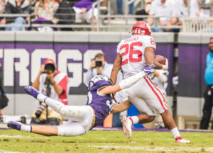 Despite trailing the Sooners by four at halftime, TCU football was unable to continue their first-half momentum as the top defense in the Big 12 allowed their highest point total of the season and fell to No. 9 Oklahoma, 52-27. “The narrative of this game is Oklahoma played good,” said head coach Gary Patterson. “We only gave up seven more points than Texas did two weeks ago. We have to make better plays because we’re a better defense. I’m not going to give my defense any outs. Offensively, you can’t start slow.” Oklahoma quarterback Kyler Murray was able to find open receivers from the start, completing 11 of his first 13 passes for 127 yards and two touchdowns. He hit wide receiver CeeDee Lamb for a 37-yard catch-and-run on what appeared to be a busted coverage in the TCU secondary as well as receiver Lee Morris for nine-yard strike in the back of the end zone. “They ran a route that shouldn’t have been open,” said Patterson. “It’s because [freshman safety Trevon Moehrig-Woodard] didn’t run straight down the field with him. He’s going to be a really good player. He’s the one guy today that ran down Kyler Murray any time he had an opportunity to run down Kyler Murray. The game was not too big for him.” However, a game of rock, paper, scissors between Lamb and fellow OU receiver Marquise following the first touchdown of the game forced the Sooners to kick off from their own 20 to one of the Big 12’s most dangerous return men in KaVontae Turpin. The senior took the kick back for a career-long 99 yards untouched for a touchdown. The return score was the first kick-off return the Sooners had surrendered since 2011. “Turpin can light up a stadium, he’s awesome,” Patterson said. “You also have to give the group that blocked for him a great job on punts and kickoffs. We didn’t play well last week on special teams, but we played a lot better today. They gave us a great opportunity or they scored. That’s what you’re looking for in your special teams.” Turpin’s burst was sandwiched between three punts by the Horned Frogs as the Sooners found the end zone on their first four possessions, building a 21-point lead, 28-7, with 8:25 to play in the half. KaVontae Turpin’s 99-yard kick return was the longest of his career. Photo by Cristian ArguetaSoto. After the Shawn Robinson-led attack punted three consecutive drives, Patterson turned to Michael Collins. The Penn transfer sparked a run of 17 consecutive points for TCU. The sophomore was inserted into the contest and three plays later, he hit Turpin on a 41-yard screen pass down the left sideline, which cut the lead in half, 28-14. “It helped, just having those guys like him make plays around me,” Collins said. “They just boost my confidence, they can take it all the way at any time and that was pretty cool.” On Collins’ next pass, he found wide receiver Jalen Reagor for a 33-yard scoring strike in the back of the end zone, which trimmed the Sooner advantage to seven. Michael Collins escapes an Oklahoma defender. Photo by Cristian ArguetaSoto. Patterson’s defense continued the momentum, forcing back-to-back punts, which allowed the Horned Frogs to add three more points before the half, as the Horned Frogs walked into the locker room down just four, 28-24. However, the Sooners regained control in the second half, outscoring the Horned Frogs by 21, 24-3. Murray finished with 213 yards passing and four touchdowns through the air to go along with 51 yards on nine rushes. The Sooner running back duo of Trey Sermon and Kennedy Brooks combined for 323 yards rushing and three scores as Oklahoma racked up 536 yards of total offense. Both rushers eclipsed 100 yards on the ground, the first time that’s happened against a TCU defense since 2016, when Kansas State’s Justin Silmon and Jesse Ertz accomplished the feat. “They have some physical running backs, OU always does, but it’s not that we can’t tackle them, we could do better at it, but they definitely ran hard and gave us their best,” linebacker Ty Summers said. “They just have a bunch of difference-makers across their team at the skill positions, a physical offensive line so that makes them a threat as one of the top teams in the nations. When you play a team like that you have to meet that level with that kind of intensity, and we weren’t able to today.” Kennedy Brooks runs it in for a 21-yard touchdown. Photo by Cristian ArguetaSoto. Collins had a much rockier second half after suffering a blister on his throwing hand after he stiff-armed an Oklahoma defender at the end of a seven-yard run. Following the blister, Collins was just three of 12 passing with an interception on his own 12, and eight of his final nine passes were incomplete. His one completion was for a loss of four yards. Overall, the sophomore finished seven of seventeen passing with 142 yards, two touchdowns and one interception. “I thought he came in and managed the ballgame pretty good for a guy who hadn’t been in that much, and that’s a high-level team that he played against,” Patterson said. Collins didn’t think as highly of his performance as his coach did. “I wouldn’t call it that much success, we still lost, so I’m just focused on what the team is doing,” Collins said. “All season I’ve been preparing like I’m the starter, staying in the film room and in practice expecting that I’m going to go in, so I have to be ready to go out and play.” Patterson refused to talk about there being a quarterback situation between Robinson and Collins. “I’m not going to make it about a quarterback controversy… now, we have to go beat Kansas,” Patterson said. “The bottom line is we got beat 52-27, so we’re 3-4 and we have quite a road to battle back. We have to play at Kansas, a place where we haven’t played overly well.” The Frogs will travel to Lawrence, Kan. to face the Jayhawks next Saturday, Oct. 27. Kickoff is scheduled fo