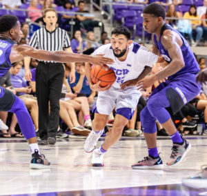 RJ Nembhard (22) dribbles by Owen Aschieris (31) at the Frog Army Scrimmage on Nov. 2, 2018. Photo by Cristian ArguetaSoto. Head basketball coach Jamie Dixon arrived at TCU in a hurry to succeed. An NIT Championship, followed by the first NCAA Tournament appearance since 1998 has TCU starting the season as a top 25 team. But Dixon wants more. “In my mind it hasn’t been fast enough, we’re in a hurry even though I know it takes time and patience to get better,” said Dixon. He’s looking for No. 20 TCU to make back-to-back NCAA Tournament appearances for the first time since 1952-1953. After making the leap offensively last season, scoring 82.1 points per game, up nearly seven points from the 2016-2017 season, this year’s climb back to the Big Dance will start with defense. TCU head coach Jamie Dixon leads the Horned Frogs through practice in preparation to face Syracuse in Detroit during the team’s first-round NCAA Tournament Game. Photo by Cristian ArguetaSoto. The Horned Frogs will look vastly different as Vladimir Brodziansky and Ahmed Hamdy have graduated and been replaced by a couple of near-seven footers at center in redshirt first-year Kevin Samuel and the No. 1 junior-college recruit Yuat Alok and two more 6’10 first-years in Angus McWilliam and Russell Barlow. Kevin Samuel competes in the dunk contest at the Frog Army Scrimmage on Nov. 2, 2018. Photo by Cristian ArguetaSoto. “We’re going to be a different team since we don’t have anyone that can score on the block like Vlad,” Dixon said. “With Kevin and Yuat, they’re more of a threat offensively than I thought they were, so we adjusted what we’re doing. We’re going to incorporate them a little bit more than what we had anticipated.” At the power forward position, the team returns both Kouat Noi, the Big 12’s fourth-leading three-pointer shooter (43.4 percent) and one of its more tenacious defenders in JD Miller. Dixon said the team is working on improving their defensive and rebounding skills. Dixon has high expectations for Miller, who’s entering his senior year. “We need him to be a great defender and rebounder for us,” Dixon said. “He’s built to be a good defender. I challenged him to be the best defender in the league. He’s got wingspan, athleticism, size.” JD Miller shoots a free throw at the Frog Army Scrimmage on Nov. 2, 2018. Photo by Cristian ArguetaSoto. Last season, the defensive numbers slipped as the Horned Frogs points per game allowed figure jumped from 69.7 to 75.4. “We lost our depth and we were limited to begin with,” Dixon said. “I think the biggest component to a good defensive team is depth.” Dixon said one area of focus for defense has been the three-point line, where TCU’s opponents hit on 37.6 percent of their attempts from beyond the arc. “We did a little better at that toward the end of the year,” he said. “Our defense did improve down the stretch, but it took us a little to too long to get that point.” The replacement of Kenrich Williams, the heart and soul of Horned Frog basketball, falls on the shoulders of a TCU backcourt full of experience. Senior point guard Alex Robinson, who received a Preseason Big 12 Honorable Mention, averaged 6.1 assists per game last season, the fourth-highest mark in the conference. Junior guard Desmond Bane, who’s returning as TCU’s leading scorer with 12.5 points per game last season, led the Big 12 in three-point shooting, connecting on 46.1 percent of his long-distance attempts. “Alex and Desmond are the two that have been out there every day which is not a surprise, those are two you can count on all the way through,” Dixon said. “We need to practice to get a little bit better, but I like what we’ve gotten out of those guys as far as effort in practice.” TCU senior point guard Alex Robinson (middle) first-year point guard Kendric Davis (right). Photo by Cristian ArguetaSoto. The return of junior point guard Jaylen Fisher, who’s coming off another season cut short by a right knee injury, will also alleviate Williams’ graduation to the NBA. Three days before his injury, Fisher was showing signs of a breakthrough, scoring a season-high 22 points on 9-of-17 shooting and 4-of-9 from the three-point line in a Jan. 13 matchup at Oklahoma. In Fisher’s absence, it will be on a few highly-touted recruits to step up in four-star, first-year guards Kendric Davis and Kaden Archie along with 2017 four-star recruits, redshirts Lat Mayen and RJ Nembhard. Hopes are especially high for Davis, a point guard who has exceeded expectations in fall practice. “I like Kendric a lot, he has a lot to learn, but he’s competitive, and he has a good skill set,” Dixon said. I think he’s going to be a good player.” First-year forward Kaden Archie dunks at the Frog Army Scrimmage on Nov. 2, 2018. Photo by Cristian ArguetaSoto. The Horned Frogs begin their road to the NCAA Tournament with their season-opener Wednesday night against California-State Bakersfield. Tip-off is set for 8 p.m.
