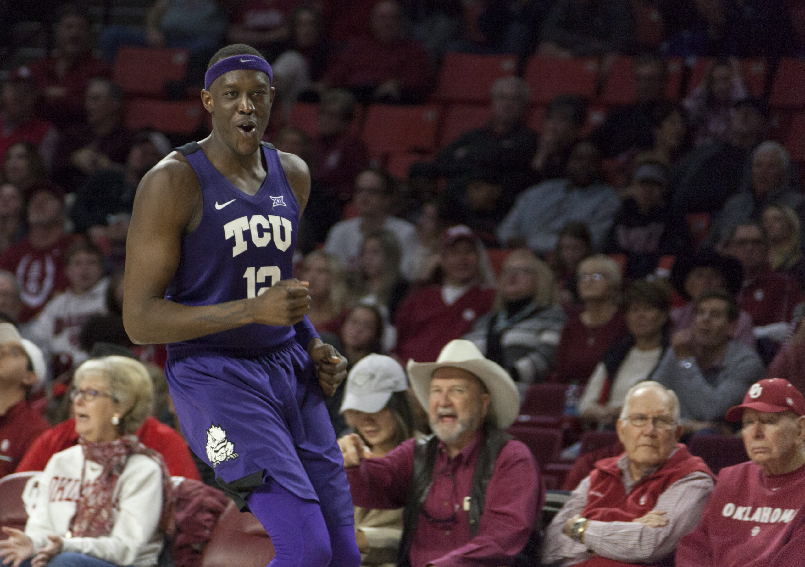 Oklahoma forward Kristian Doolittle banks in the game-winning shot over TCU center Kevin Samuel two two seconds to play in Norman. Photo by Melissa Triebwasser. Despite a career-high 30 points on 8-12 three-point shooting from Kouat Noi, TCU men’s basketball fell to the Oklahoma Sooners 76-74 Saturday, dropping to 1-2 in conference play. “He did a lot of great things, hit the shots and set the screen on the play to tie it up that got Alex [Robinson] a wide-open look,” TCU head coach Jamie Dixon said. “Obviously we felt could’ve and should’ve won the game, but we didn’t.” The loss drops No. 25 TCU’s road losing streak against ranked opponents to 48 games. “We have to defend better, 49 percent from the field for them was clearly the difference,” said Dixon. “We had opportunities, our execution down the stretch was pretty good with our three three-pointers out of timeouts with plays that we ran, but we didn’t get the stops we needed to get.” The Sooners made 17 of their 25 free throw attempts while the Horned Frogs converted on 12 of their 16. TCU shot 35 percent from the floor while Oklahoma hit on 49 percent of their looks from the field. “It is difficult, but we have nobody to blame but ourselves,” said Robinson. “They shot a high percentage from the field, it’s not what we thought our identity was coming into Big 12 play. We have to do better defending.” The key statistics Dixon lamented about following his team’s second-straight, single-digit road defeat was rebounding and second-chance points. Despite outrebounding the Sooners 42-36 with 17 offensive rebounds, they only scored eight points off their extra opportunities. “We have to finish better, finish stronger, and not look for calls,” said Dixon. “We need to a better job finishing through contact.” The first half was a back-and-forth affair until Noi caught fire. He sparked a 13-0 TCU run in which he drilled three consecutive shots from behind the arc. Guards Desmond Bane and Robinson would cap the run with lay-ups, which put the Horned Frogs up nine, 36-27, with 6:29 remaining in the half. TCU forward Kouat Noi celebrates after hitting one of his career-high eight three-pointers. Photo by Melissa Triebwasser. TCU would take a six-point lead into the locker room, 43-37, but the Sooners scored eight of the first nine points to begin the second half, which evened the contest at 44 with 16:11 to play. Oklahoma took their first lead of the second half at 48-47 with 13:45. All five Oklahoma starters scored during their 11-4 run. Noi would return the lead to TCU, 52-51 after hitting his sixth three-pointer with 11:17 remaining. TCU secured a 71-69 lead with less than a minute to play, but a turnover by guard RJ Nembhard resulted in a three-point play for Sooner guard Christian James after converted his running and-one lay-up. James finished with 15 points and eight rebounds. Trailing by three, 74-71, and the clock winding down, Robinson drilled the game-tying three-pointer from the top of the key with 16 seconds remaining. Robinson finished with 16 points in addition to eight rebounds and four assists. Oklahoma answered with forward Kristian Doolittle banking in a jumper from the right block with 2.8 seconds, which gave him 24 points to go along with 10 rebounds. “It’s disappointing to us as we’ve gotten beat in the post the last two games with Lawson and now Doolittle,” Dixon said. “I’d like to be more physical, but we had guys in foul trouble, which is a challenge. Our defense was good at the beginning of the year, but it’s let us down the last two games and it wasn’t good enough in the win against Baylor. Doolittle went at us with a lot of post-up finishes around the rim and he drove it to the rim as well. Give him credit.” In the final seconds, guard Kendric Davis attempted a running three-point attempt for the win but it grazed the front of the rim. Noi inbounded the ball to Davis and said the play was designed for him to get the ball back, but there ended up simply not being enough time on the clock. “There’s not a lot of time with 2.8 seconds, we got a shot at the rim, which was a pretty good look considering the timing of it all,” Dixon said. “They trapped the ball, which we knew would happen, Kendric split it and got as good of a look as you could get with how much time we had.” TCU’s next opportunity to snap their two-game losing streak is Tuesday back at Schollmaier Arena against West Virginia. Tip-off is set for 6 p.m.