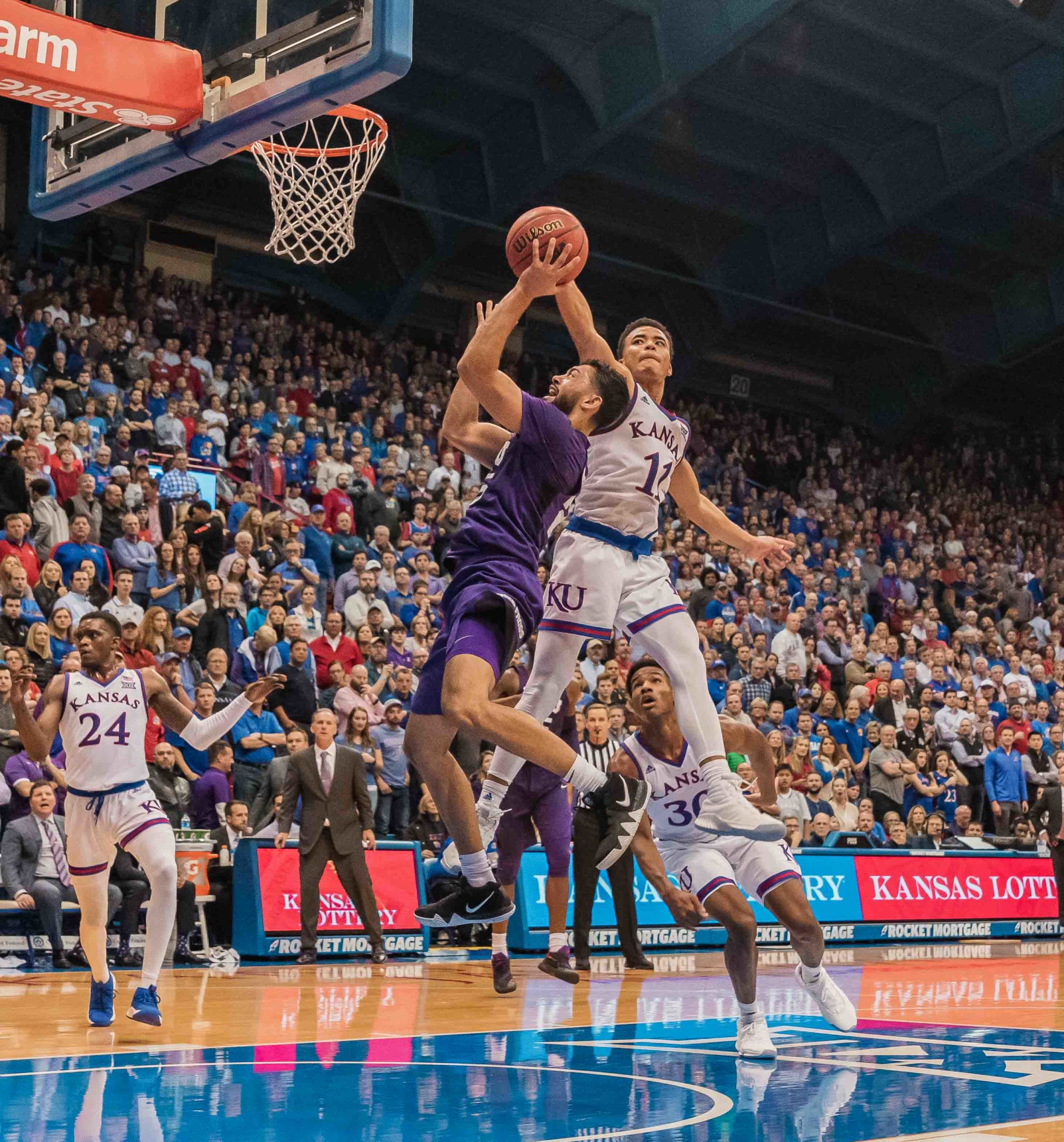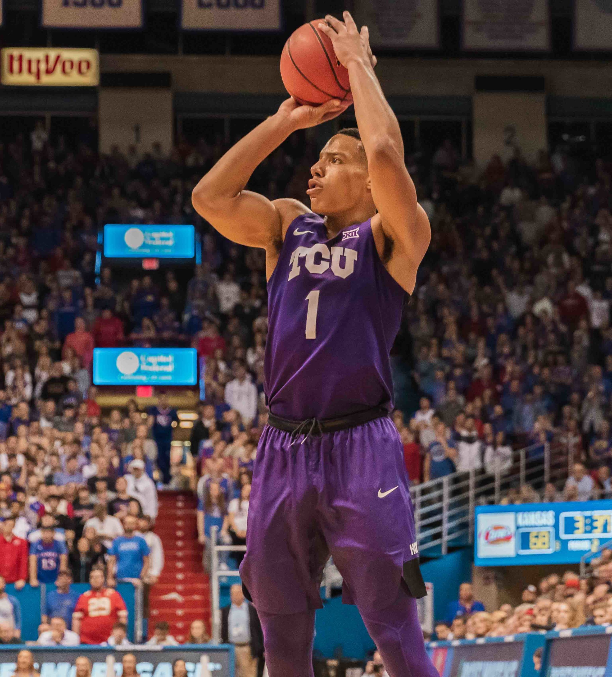 Kansas guard Devon Dotson contests TCU guard Alex Robinson’s lay-up attempt. Photo by Cristian ArguetaSoto. Two of TCU’s season-worst 20 turnovers committed late in the final 1:40 doomed their attempt to secure the program’s first win in eight tries at Allen Fieldhouse on Wednesday in Lawrence, as they fell by nine, 77-86 to the No. 7 Kansas Jayhawks. The loss snaps the No. 25 Horned Frogs nine-game winning streak and drops their record to 12-2 and 1-1 in the Big 12. “I thought we would handle the defensive pressure they would throw at us, but we didn’t,” said TCU head coach Jamie Dixon. “We’ll learn from it, but give them credit for wearing us down, going inside, and being the more physical team.” Entering the contest, TCU lead the Big 12 in assist-to-turnover ratio at 1.7, but they were only able to dish out 12 assists to their 20 giveaways. Balanced scoring allowed the Horned Frogs to hang with the Jayhawks for most of the night as five of the seven players to see the floor totaled double-digit points. Guard RJ Nembhard led the way with 14, Desmond Bane scored 13, guard Alex Robinson and center Kevin Samuel each accounted for 12, and Kuoat Noi finished with 10. TCU guard RJ Nembhard drives to the hoop against Kansas guard Lagerald Vick. Photo by Cristian ArguetaSoto. Kansas’ offense was anything but balanced as forward Dedric Lawson led all players with 31 points and 14 rebounds. “He’s good, that’s what they do, and we prepared for it by double-teaming, and he still got 31, which isn’t a good sign,” Dixon said. “He’s a good free throw shooter too, which is another problem. They do a good job getting him the ball.” Kansas also more than doubled TCU’s free throw attempts shooting 20-of-27 from the line off the Horned Frogs’ 18 fouls while TCU went 9-for-13 shooting free throws on the Jayhawks’ 13 fouls. Lawson had 9 of his 31 from the line. The Jayhawks and Horned Frogs were neck and neck for the majority of the first half, as Kansas held a one-point edge, 29-28, with 3:13 left in the first half. At the half, the Jayhawks held a nine-point lead, 40-31, as they scored 11 of the final 14 points. The first few minutes of the second half were reminiscent of the first, back and forth, but the Horned Frogs began to break through after the opening five minutes. TCU would score seven straight to trim the KU to just two, 52-50, with 12:42 left to play. Nembhard drained a three-pointer from the right wing, guard Kendric Davis finished a smooth up-and-under lay-up, and forward Kouat Noi laid-in a fast break bucket at the rim. TCU guard Kendric Davis drives to the basket against Kansas guard Marcus Garrett. Photo by Cristian ArguetaSoto. With TCU still down two after another Nembhard three-pointer, 55-53, the Kansas defense tightened, forcing three turnovers that allowed them to take an 11-point lead, 64-53, with 8:05 remaining. The Horned Frogs wouldn’t go away, scoring six in a row courtesy of lay-ups from Robinson, Davis, and Samuel, which left them down five, 64-59, with 5:08 left to play. However, the Jayhawks countered with two more Lawson free throws and a Vick jumper to go back up nine, 68-59. TCU would answer with back-to-back three-pointers from Robinson and Bane, which had the Horned Frogs down three, 68-65, with 3:34 to go. TCU guard Desmond Bane pulls up for a three-pointer against No. 7 Kansas. Photo by Cristian ArguetaSoto. A couple minutes later, Robinson drilled a three-pointer that kept TCU within three, 71-68, but those would be the final Horned Frog points of the night as back-to-back turnovers by Noi and Bane hampered the TCU offense while the Jayhawks added a lay-up and a few more free throws to close out the night. The Horned Frogs return to action Saturday in Norman against No. 23 Oklahoma.