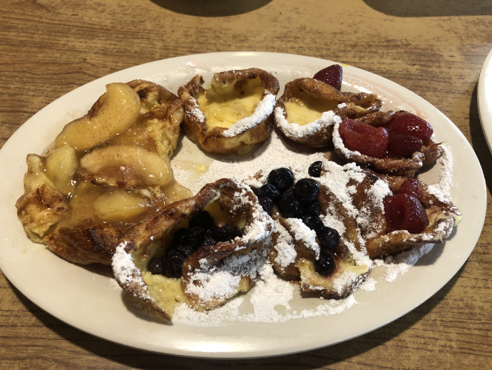 The German pancakes are a combination of a pancake and a crepe, and they are topped with butter, powdered sugar and your choice of lemon, apple, blueberry or strawberry topping.