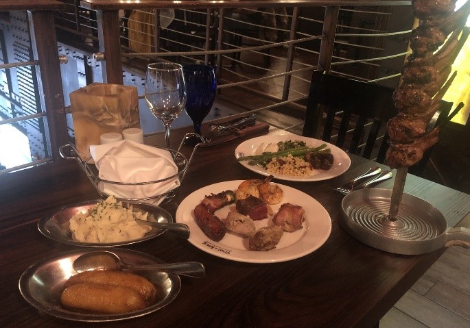 Flipping the table card from red to green will send out “gauchos” to the table with a wide variety of meat on skewers from which to choose.