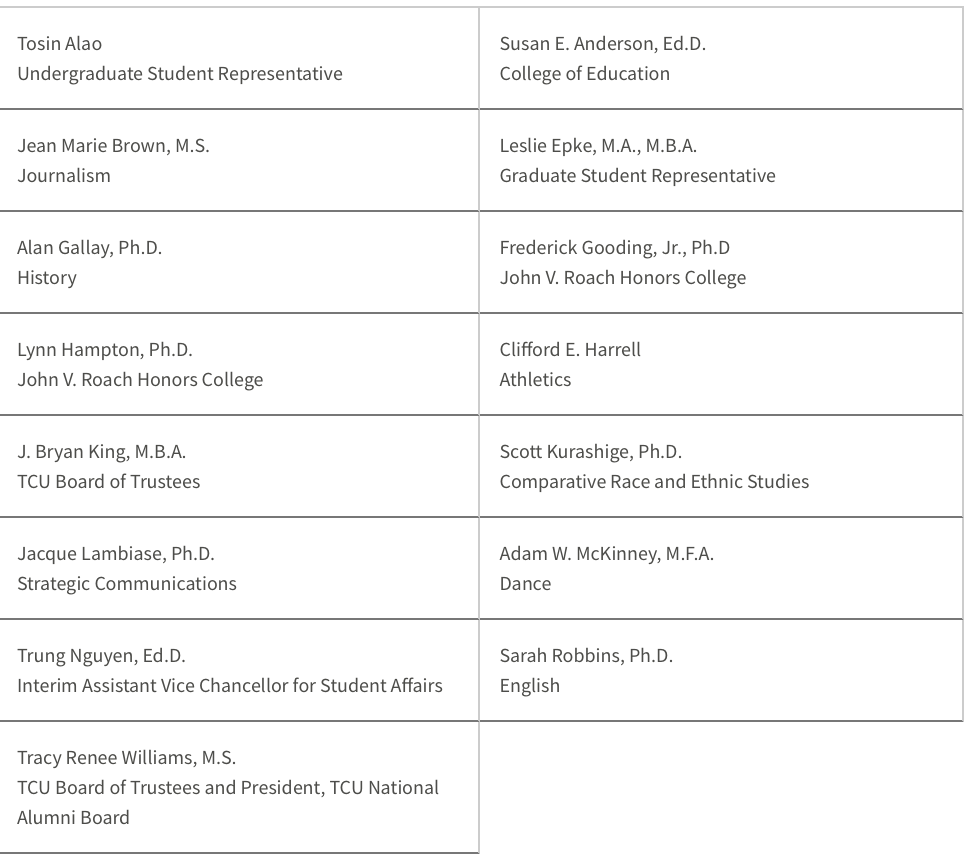 “Racism has been consistently present for far too long, and many recent incidents, including the deaths of George Floyd and many others, have awakened a passion for true equity and justice,” Boschini said in the July announcement. “It is imperative that we, as stewards of TCU, do everything we can to instill, and live, very real change.”